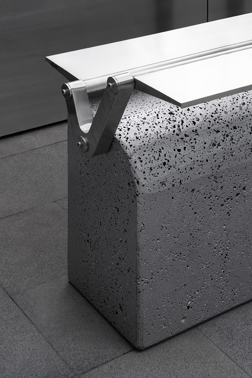 主要用材:泡沫铝(上海益荣金属材料有限公司)、贝多魔磨石地面(上海朵颐新材料科技有限公司)、雾面不锈钢(精钢世家)、火山石(上海金天迪建材有限公司)、渐变膜(台州贝莎美新材料有限公司)