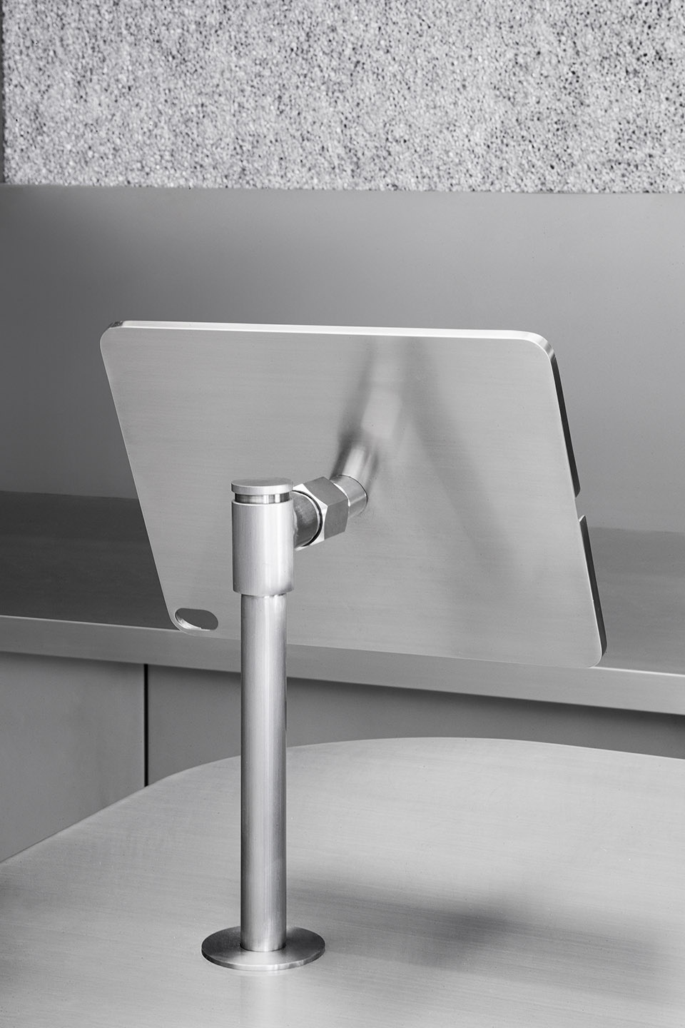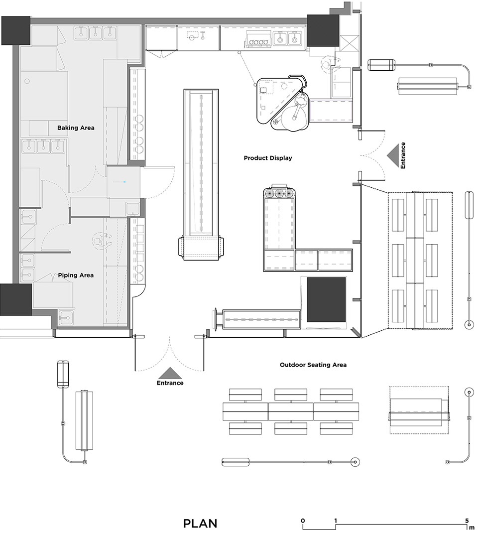 设计师将烘焙产品的陈列纳入对设计的考量之中,将机械部分的喷砂不锈钢与局部照明部件结合起来,借此在食物的温度与材料的冰冷之间制造戏剧式的冲突,将顾客的注意力聚焦在食物本身。
