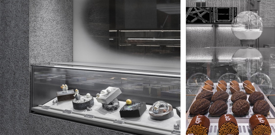 The designer took the dessert products into consideration and integrated the sandblasted stainless steel with lighting installations, trying to create a contrast between the coldness of the material and the warmth of the desserts to strengthen customers’ attention on the latter.