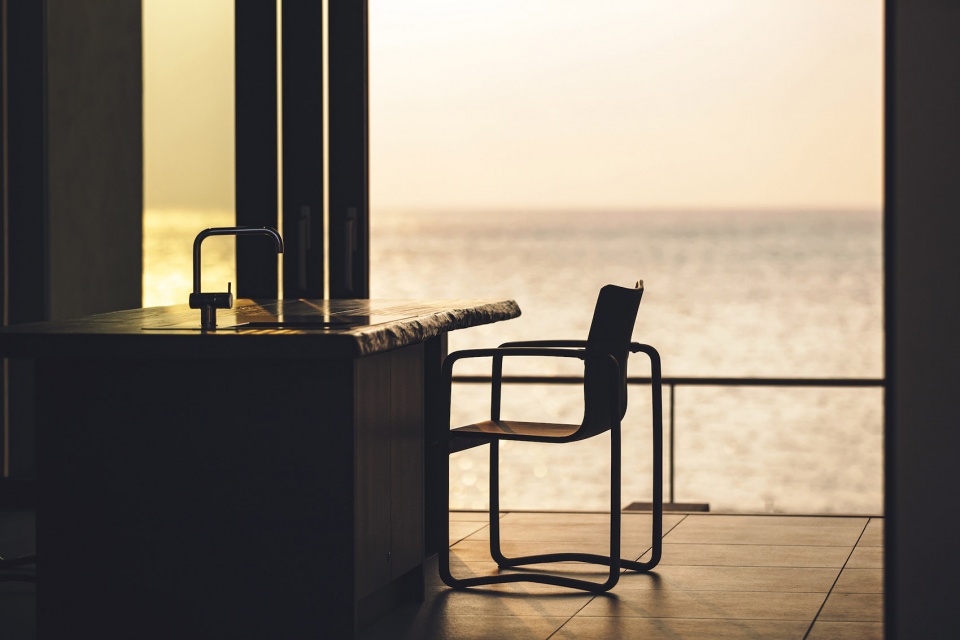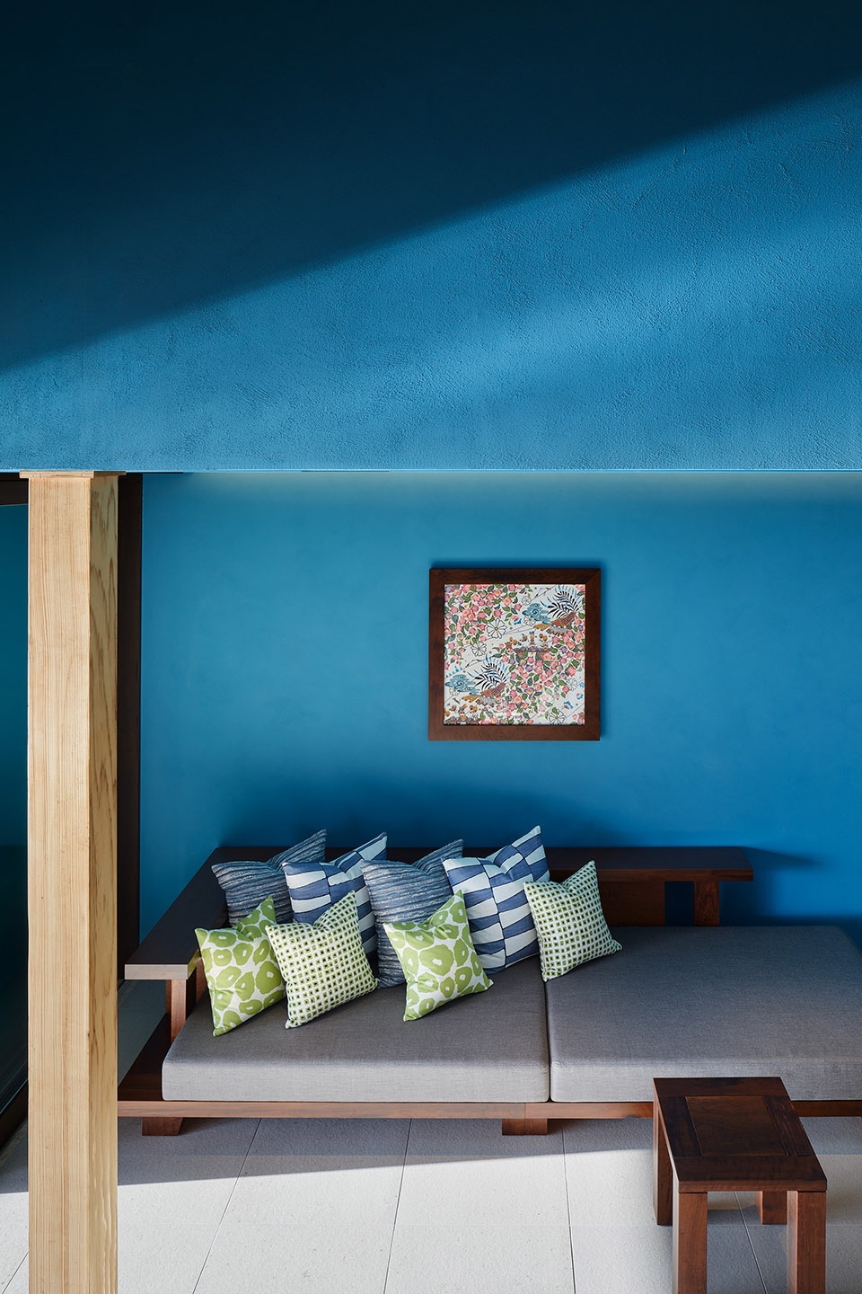 To create a resort experience that provides freedom and flexibility in how the guest spends their time, we designed every villa and suite around an indoor patio that serves as the guest’s center of activity. Featuring a long table combined with a kitchen counter, this is the first room the guest will visit upon entering their villa or suite. It is a place for dining, enjoying drinks, chatting with friends or family, or for spending time alone on work or another solo activity.