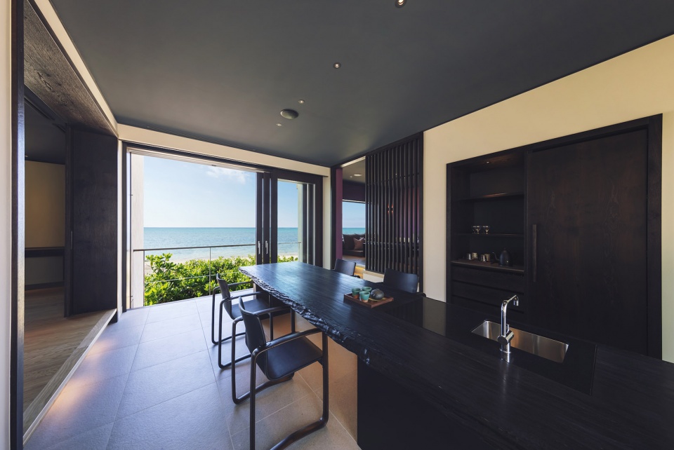 No matter where you are in your room, you will be able to feel the ocean next to you as the salty winds pass by and this is ensured by having no buildings exceeding two stories. The rooms were carefully constructed so that guests can spend time in Okinawa with supreme comfort. The entrance leads into an indoor patio designed to provide the guest with a variety of options. For example, a long table equipped with kitchen amenities allow guests to enjoy a private dinner party with meals prepared in advance by the chef in which they can finish off the cooking any time they want The main wall in the bedroom is a work of traditional Okinawan dye art, depicting Okinawa’s plants, animals, and scenes of daily life. The longer guests stay and the more they begin to accustom themselves to this relaxing Okinawan way of life, the more they might begin to see themselves in these pictures