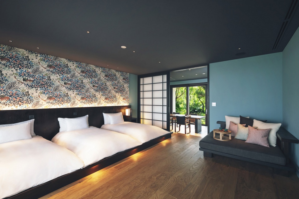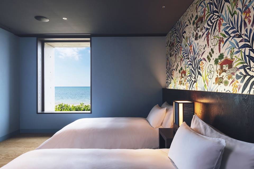 ▼Haru套房室内,墙面采用冲绳传统印染图案,interior of Haru oceanfront balcony suite, wall decorated with traditional Okinawa patterns ©Hoshino Resorts