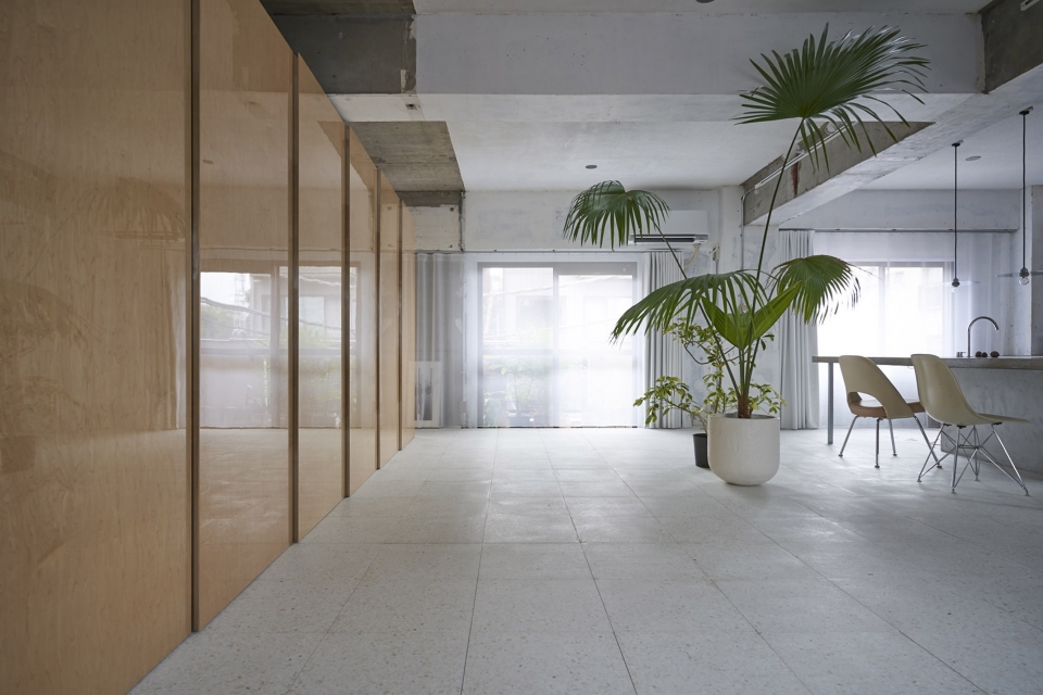 This is a renovation of a 40-year old apartment in Tokyo. All rooms had sufficient light and wind from many windows along south and north walls facing wide streets. We converted the three-bedroom apartment into a large open space and let light and wind pass through in order to make the best use of the environment. In an open plan space, we need to consider how to locate spaces involving privacy including a bathroom and bedrooms and how to provide enough storage spaces. Our solution was to provide a large closet spanning the entire width of the room.