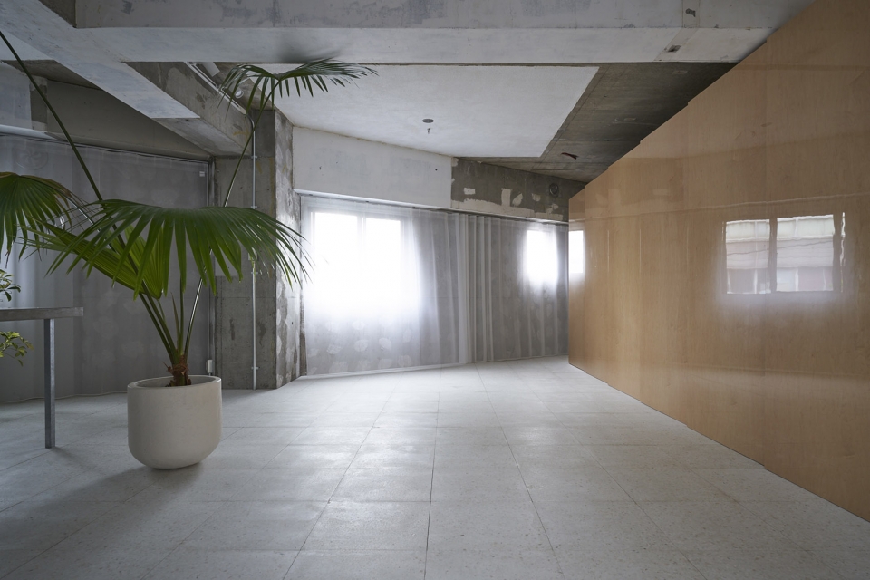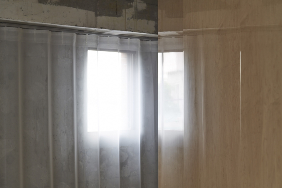 The ceiling and walls are left as they are. Instead of applying new finishes, lace curtains hung along the entire width of the walls serve as new “finishes” creating vivid contrasts with the existing walls. Delicate qualities of details and finishes stand out and a unique feeling of tension between the old and new is generated by keeping the existing state.