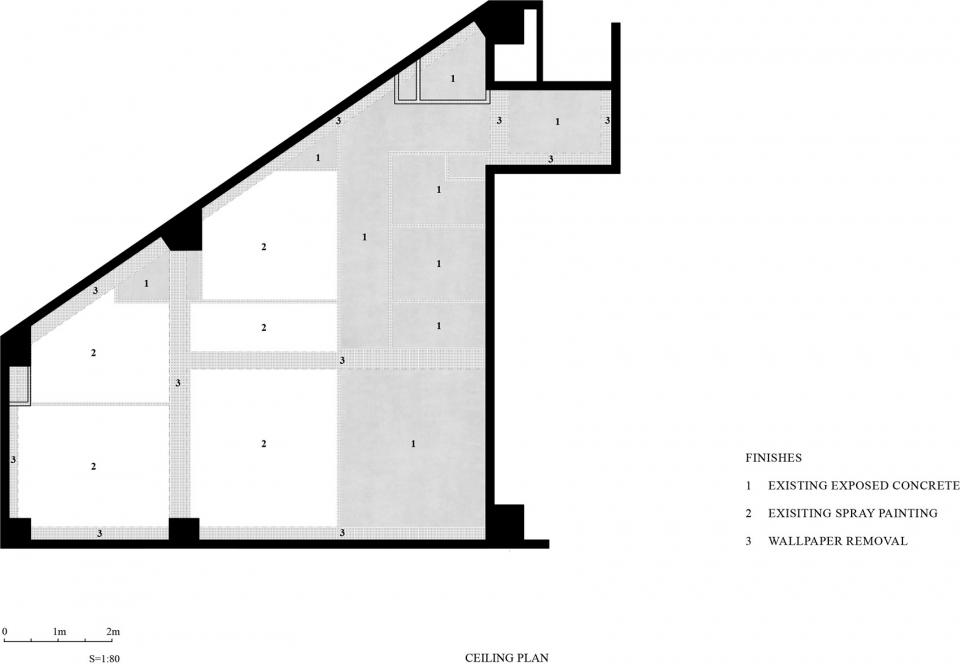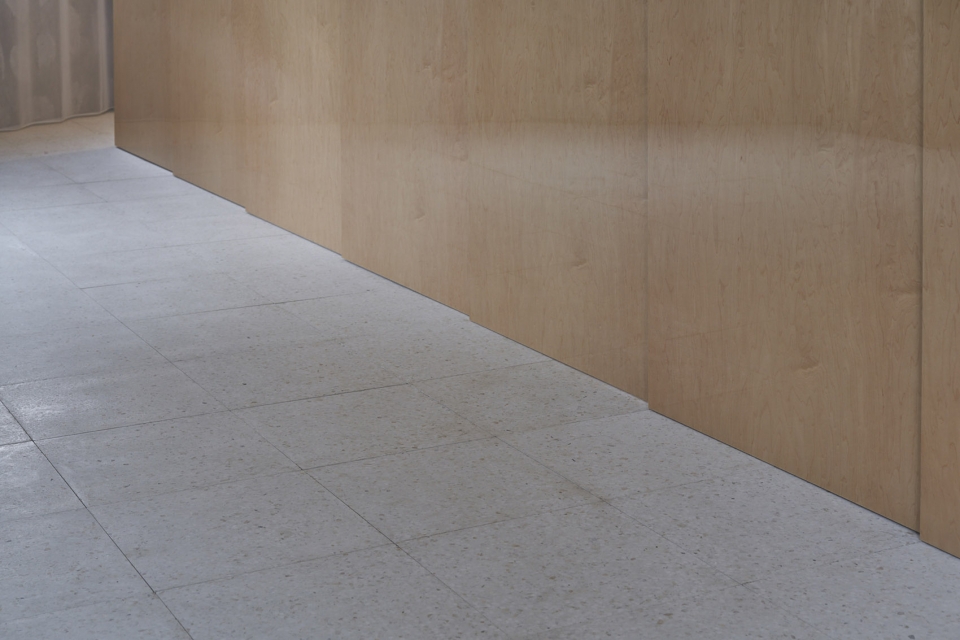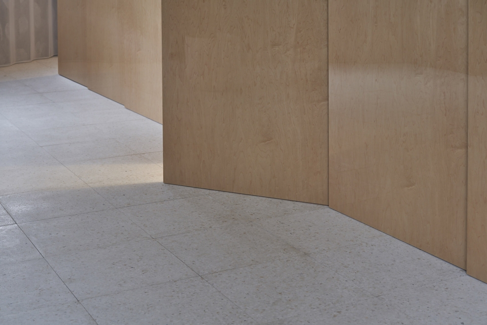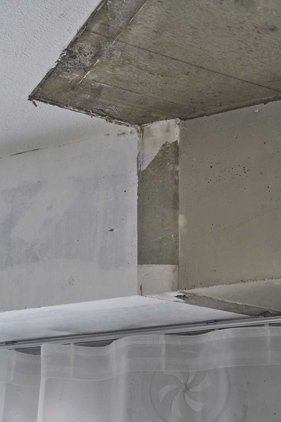 天花板与墙面维持原貌。沿着整个墙面悬挂的蕾丝窗帘作为新的“装饰面”,与现有粗糙的墙面产生对比。细部与饰面板精致的品质感脱颖而出,新旧之间产生了一种独特的张力。