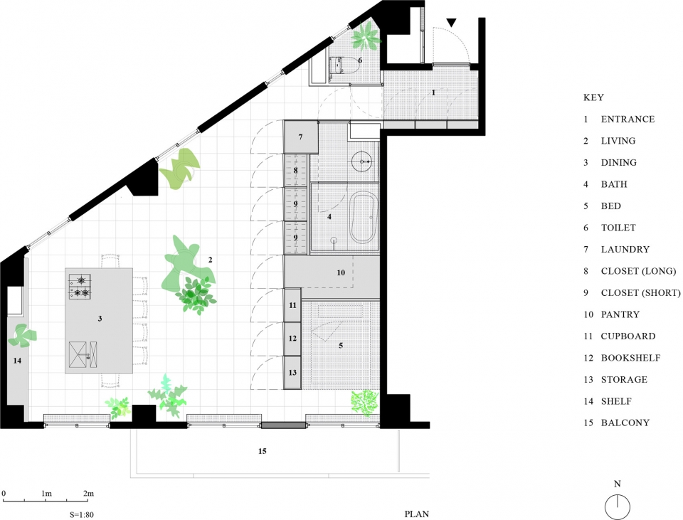 这是东京一个40年老公寓的改造项目。朝向宽阔街道的南北两面拥有大量的窗户,所有的房间都沐浴在充足的阳光与微风中。我们将三居室的公寓改造为有一个开敞大空间的场所,让光线和风自由进入,充分利用自然环境。在一个开敞的平面空间中,我们需要考虑如何布置像卧室浴室这样的私密空间并提供足够的储物空间,采取的策略是设置一个跨越整个房间宽度的壁橱。