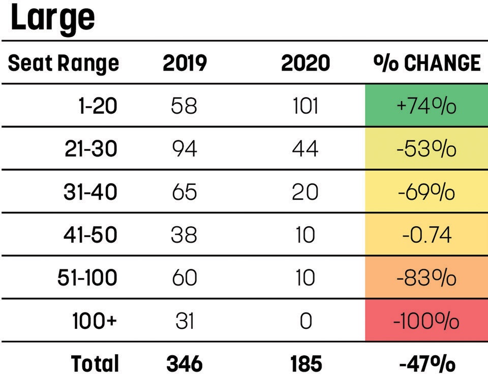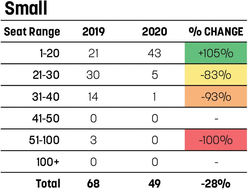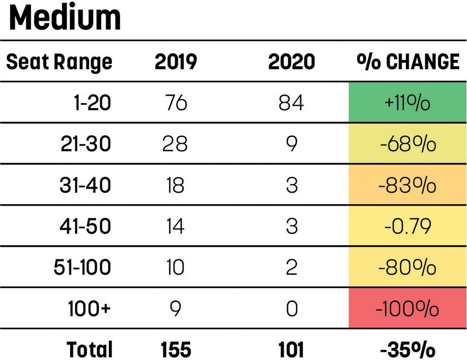 To understand the potential impact of individual strategies on an entire campus’s classroom inventory, we examined three different-sized institutions – small, medium, and large – from our database. When we examine specific size cohorts of classrooms, we find considerable variability; however, all of these institutions consistently lost 80-100 percent of their classrooms that seat over 51 students. Even in the 31-40-seat range, all three institutions lost between 69 and 93 percent of these rooms. In general, the findings from our study sample suggest that institutions of all sizes will temporarily need to conduct in-person classes in much smaller cohorts due to classroom size constraints.