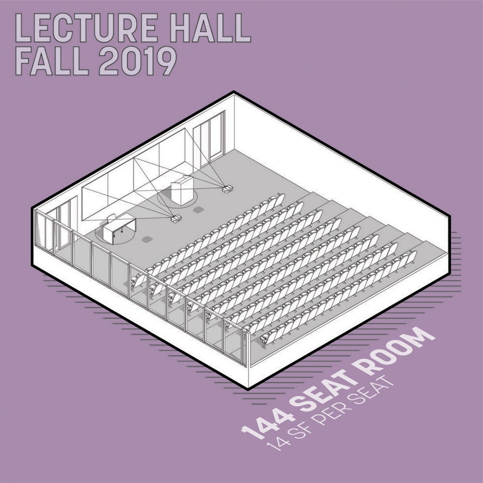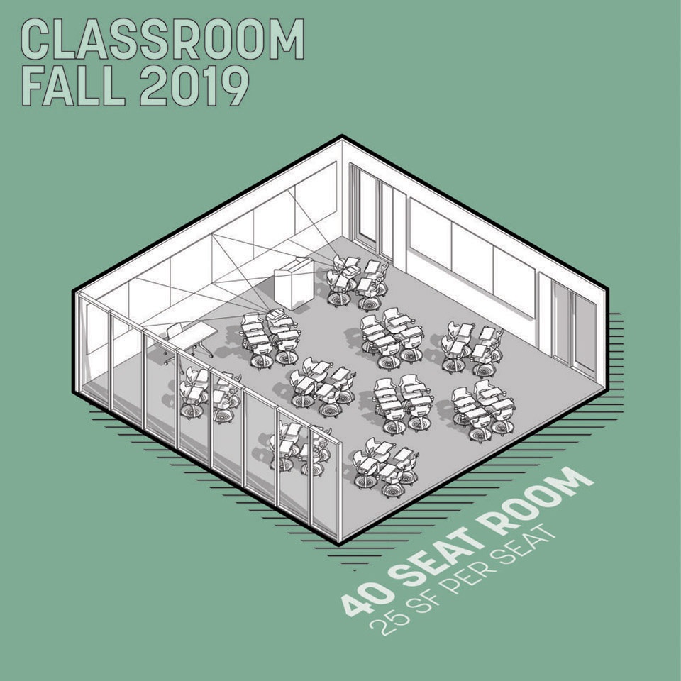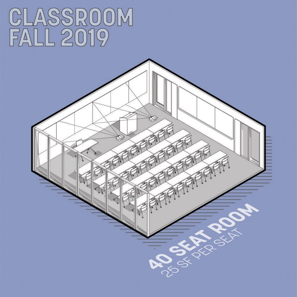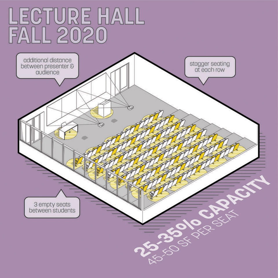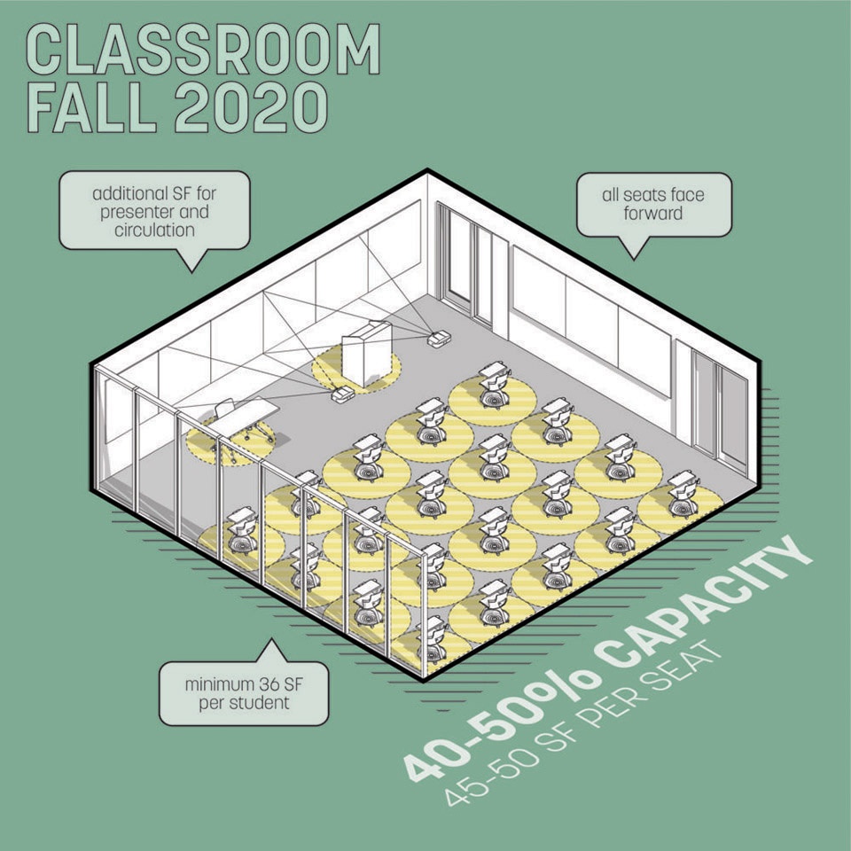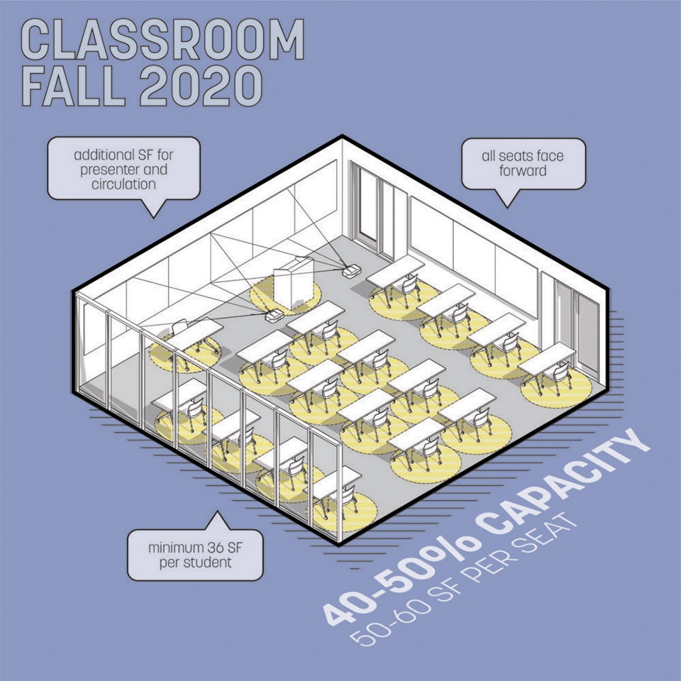 以演讲厅为例,一个144人的典型演讲厅每个座位的平均面积为14平方英尺(约1.3平米),如果每排错开并间隔三个空位,那么它的总容量只能维持25-35%。这样每个座位的空间增加了三倍,约40-50平方英尺(约3.7-4.6平米)。同时,一个典型的40人教室,每个座位平均面积25平方英尺(约2.3平米),在重新布置降低密度以满足新冠肺炎期间的规范时,只能保留40-50%的容量。