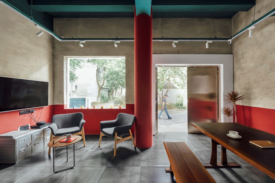 内部在保留原始结构基础上,以水泥墙面、水泥地砖为背景,通过选取马里奥兄弟的红色与绿色,将室内休闲区与功能区区分开。同一个室内空间,多种座位方式的尝试,根据每个人自己的喜好选择,完全不一样的体验。胡桃木色为主的家具与低饱和度色彩趣味的点缀,相互共存。