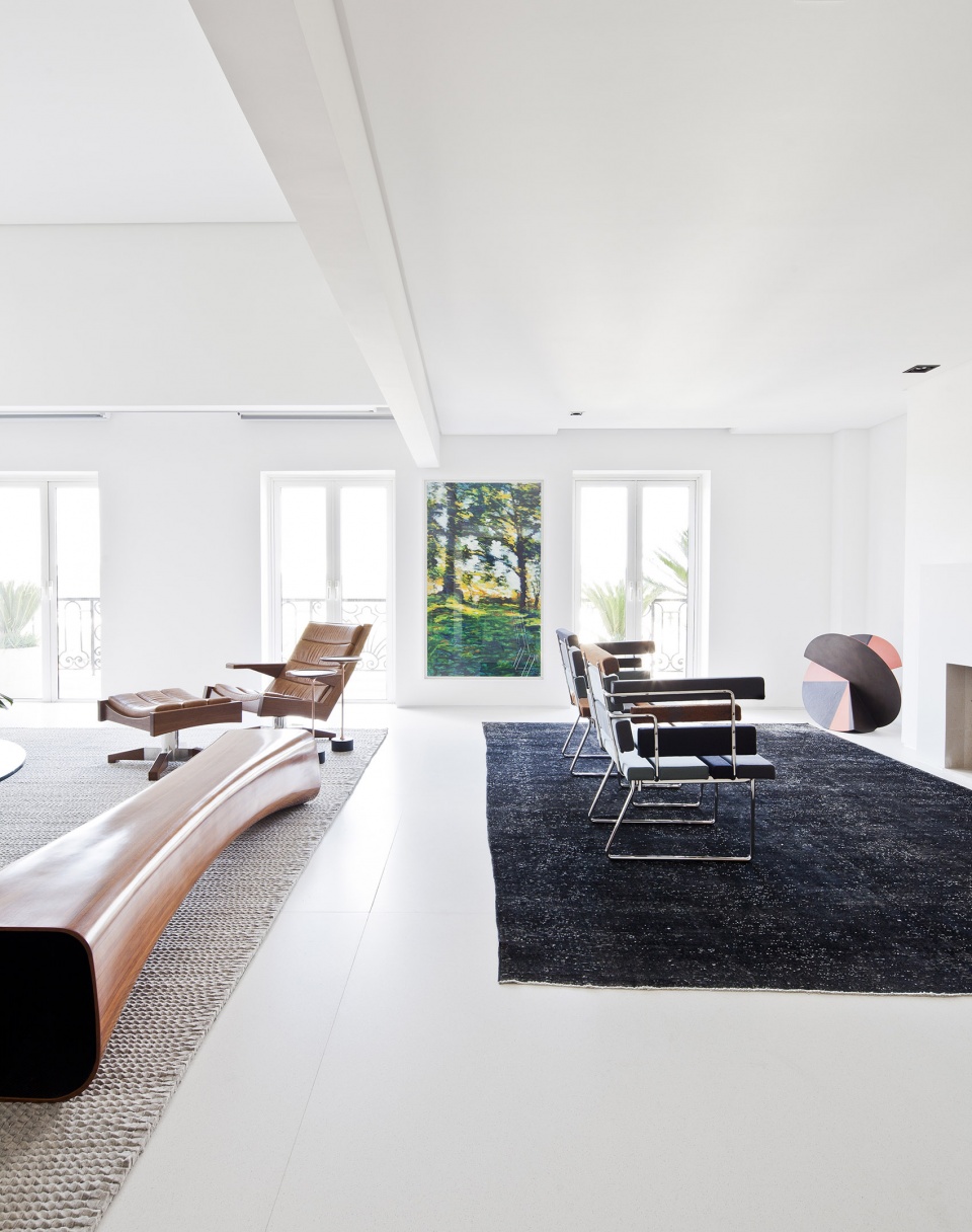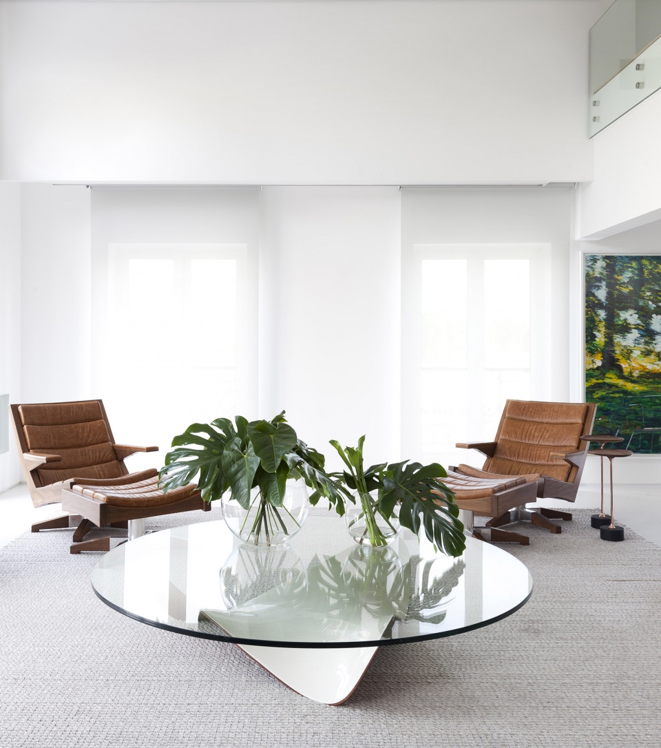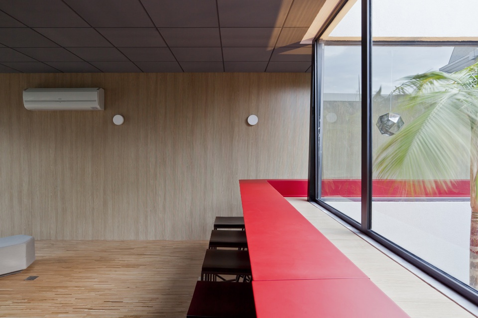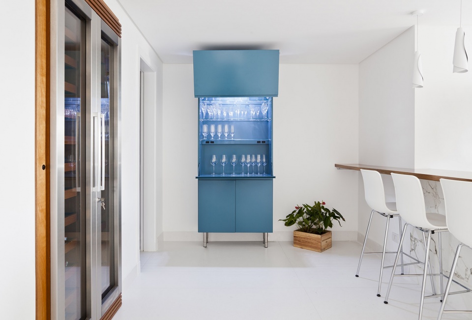 The furniture sheds light on the Brazilian design. The art pieces, carpets, among others, establish a counterpoint to the absence of ornaments and the straight lines of the residence. The main materials – wood, glass, light stone and vegetation – allow a dialogue with the environment and produce a luminous and inspiring atmosphere for the resident, who works as a writer at home.