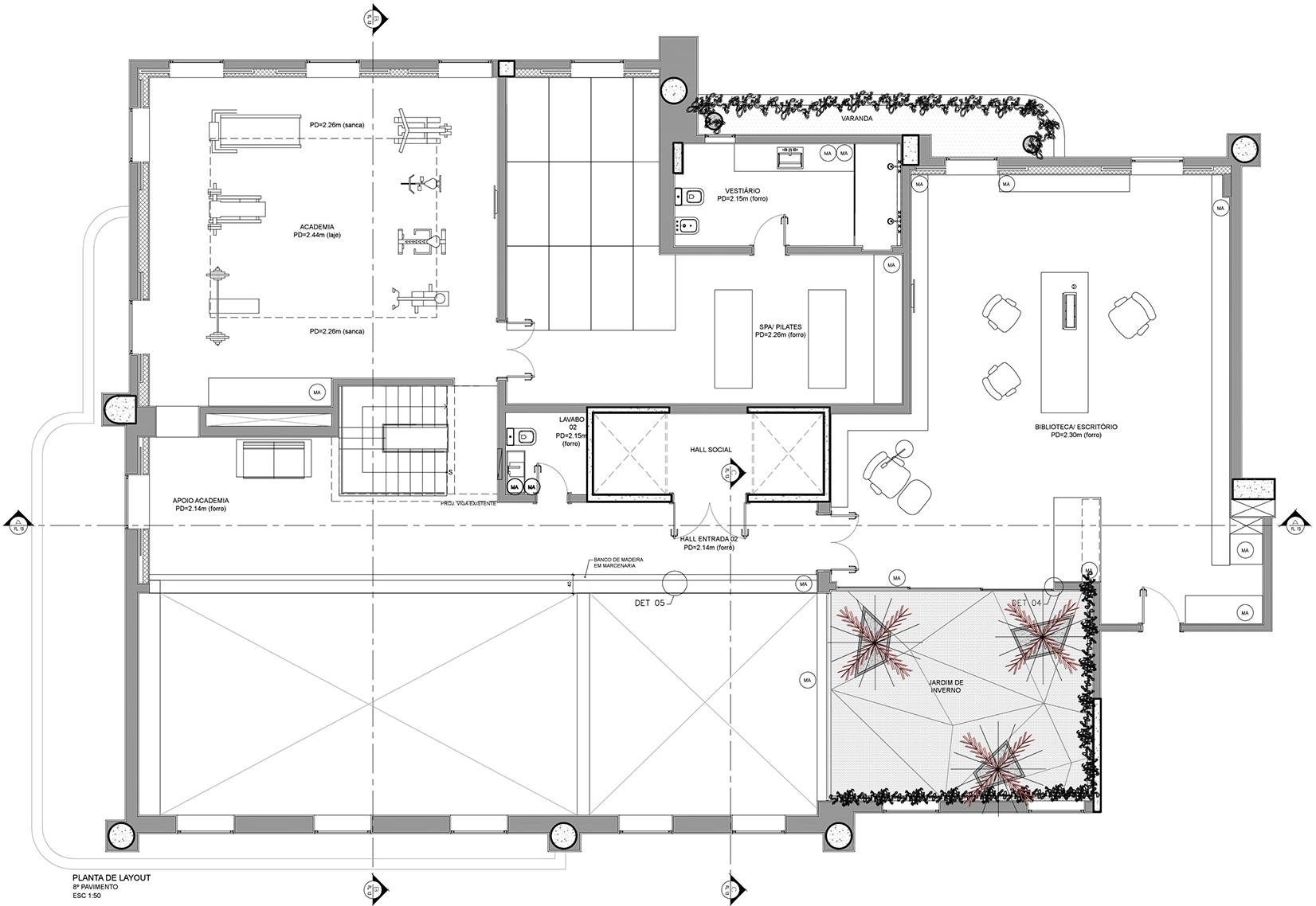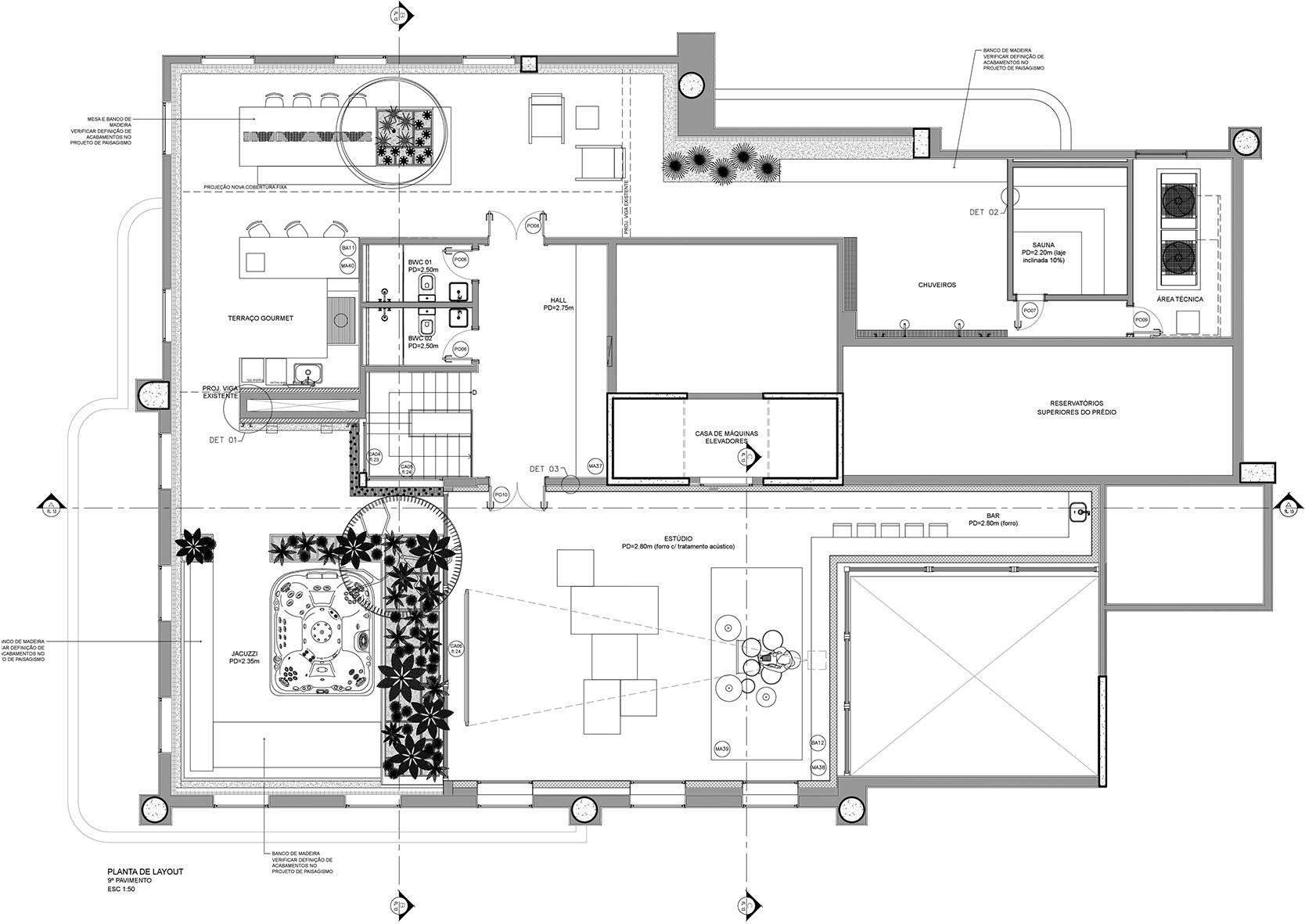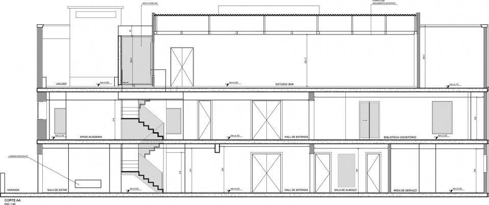 Each floor was designed for a specific use. In this order: live, work and rest. On the first level are the rooms, kitchen and service area. The second was designed to receive a library of 5 thousand titles integrated into a garden where the resident works, reads and writes. The last level brings the leisure area, with a music studio, hot tub, sauna and a barbecue, permeated by a vertical garden in all its extension.