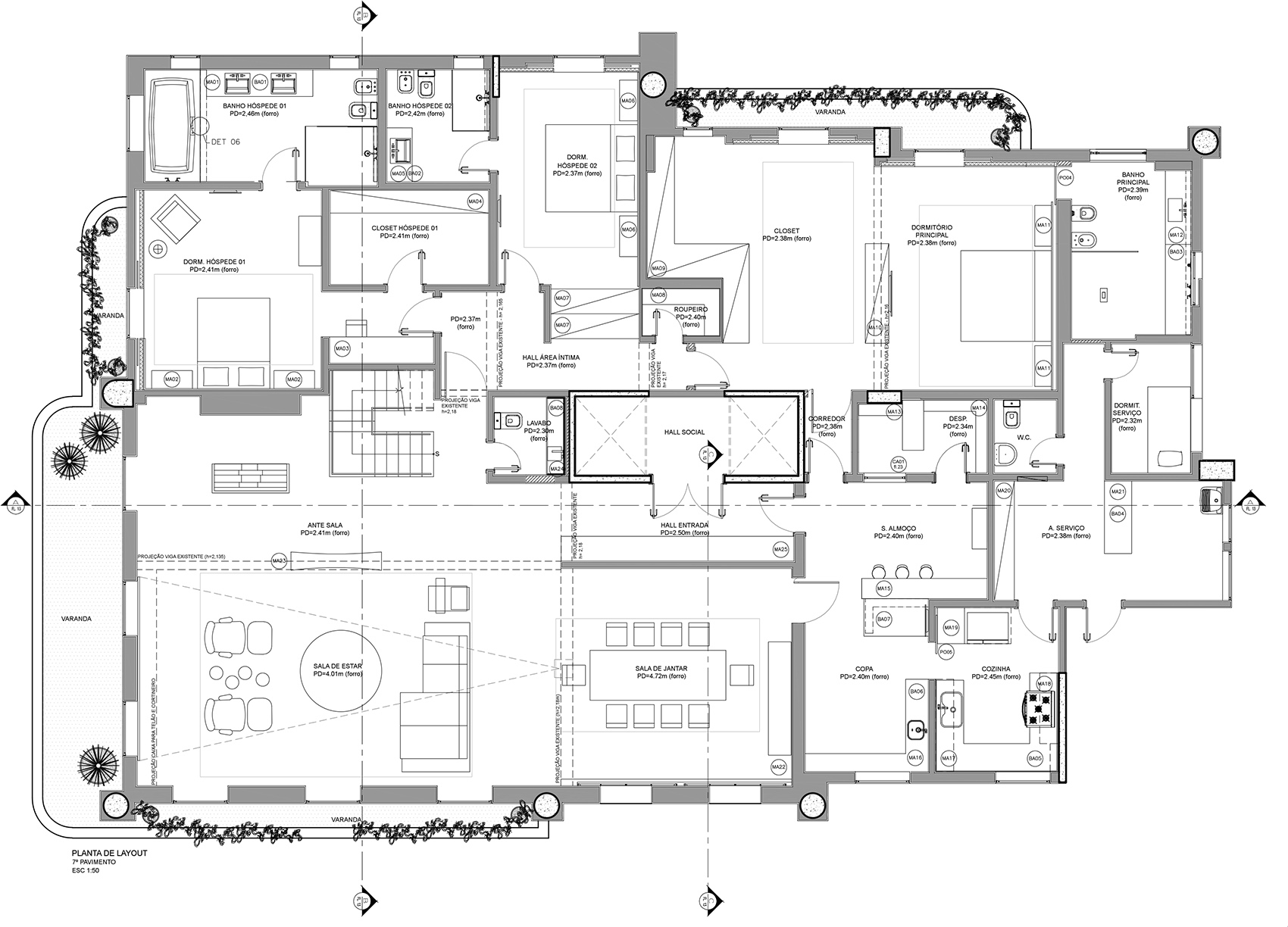 The generous openings of the walls offered a visual connection between different environments in each of the three levels of the apartment. The Project also emphasized the relationship between the environment, gardens and circulations. The staircase – a folded steel plate lined with wood on the bottom and white stone on the top – appears as the sculptural element that interlinks the three decks. The vertical structure stands out.