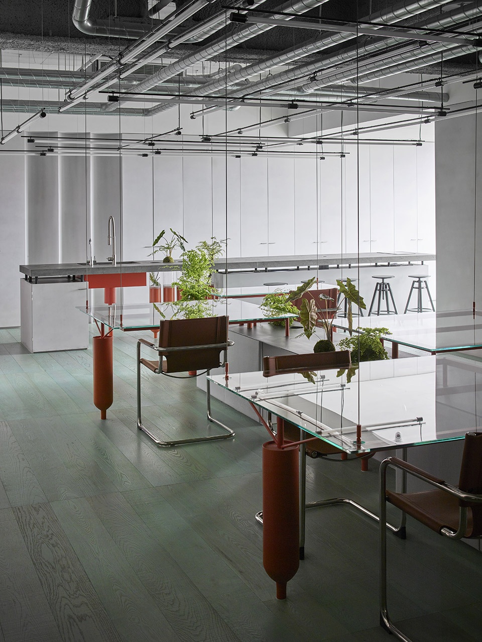 当灵感关键抓紧“科学”而非“办公室”,水相设计希望强化产业属性里的科学基底,扭转一般人对办公室的刻板蓝图。回归产品本身最贴近的实验室、工厂环境,日日可见的试管、生铁黑铁、气体输送管,以及包装承载科技气体的独特钢瓶,撷取生产链上再熟悉不过的材质与造型,拆解转换成办公空间的结构形体。