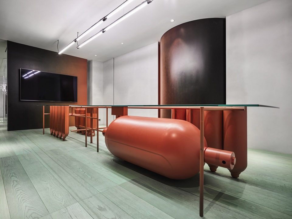瓶身统一的橘,实木地板染上的湖水色,以及由明到暗、由橘转黑的渐层烤漆,表述不同温度下气体的存在方式:因热而膨胀漂浮、遇冷则凝结沉降…橘色同时也是实验室、工厂常见重要设备的按钮,在使用者的工作经验脉络中,色彩与科学在类实验室的办公场域产生了关联。而渐变的色彩,亦如气体飘忽如云雾、液体流动难以捕捉,也替充满机械感的严谨环境注入暧昧的视觉动感和时间性。