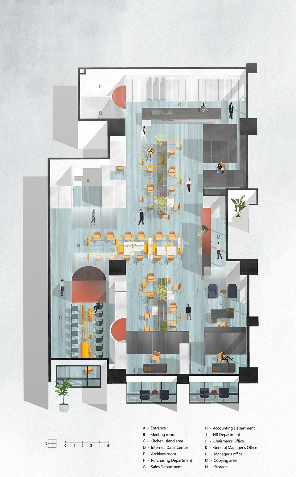 Layout: meeting area. kitchen island area. internet data center. archives room. purchasing department. sales department. accounting department. HR department. Chairman,s office. general manager,s office. manager,s office. copying area. storage