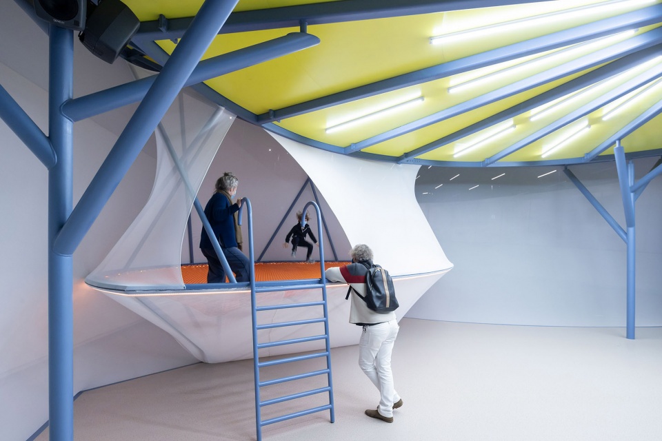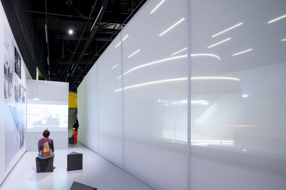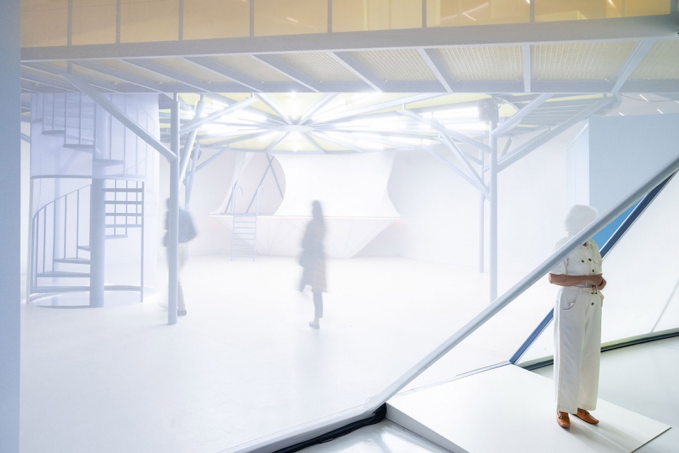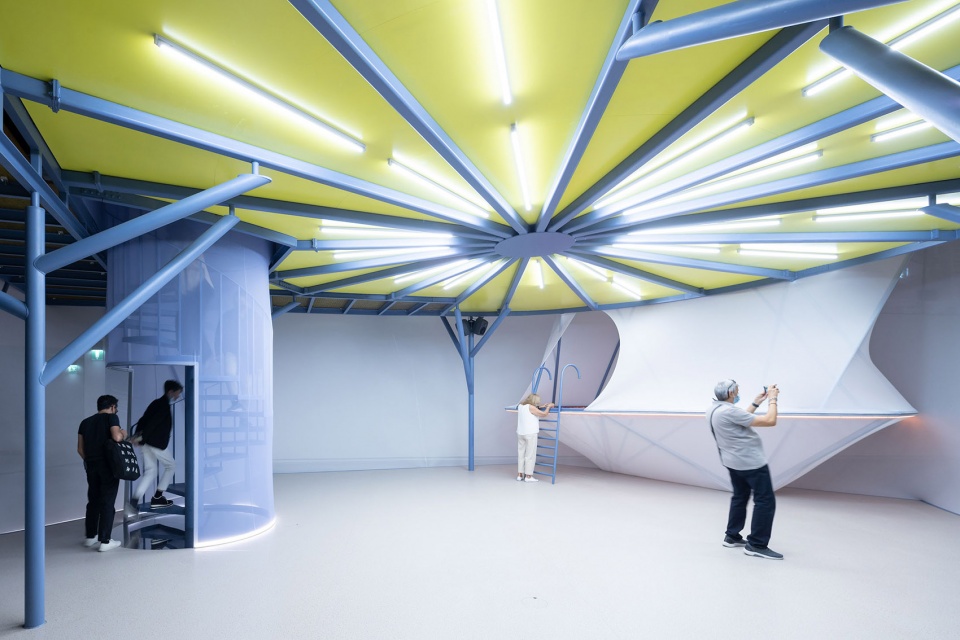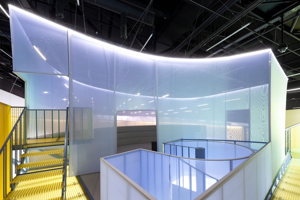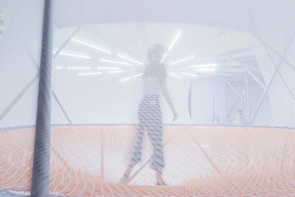 Apart from new relationships, Beeline introduces a series of spaces and experiences in its midst, that transforms the museum space into a polyfunctional civic arena. At the heart of the building, the pathway splits apart into brackets that frame spaces for gathering, over two levels, connected by a stair. By wrapping the structure in a filigree of membranes, the installation takes on a luminous aura. The various layers offer a soft enclosure between new spaces for exchange while allowing its skin to be projected upon.
