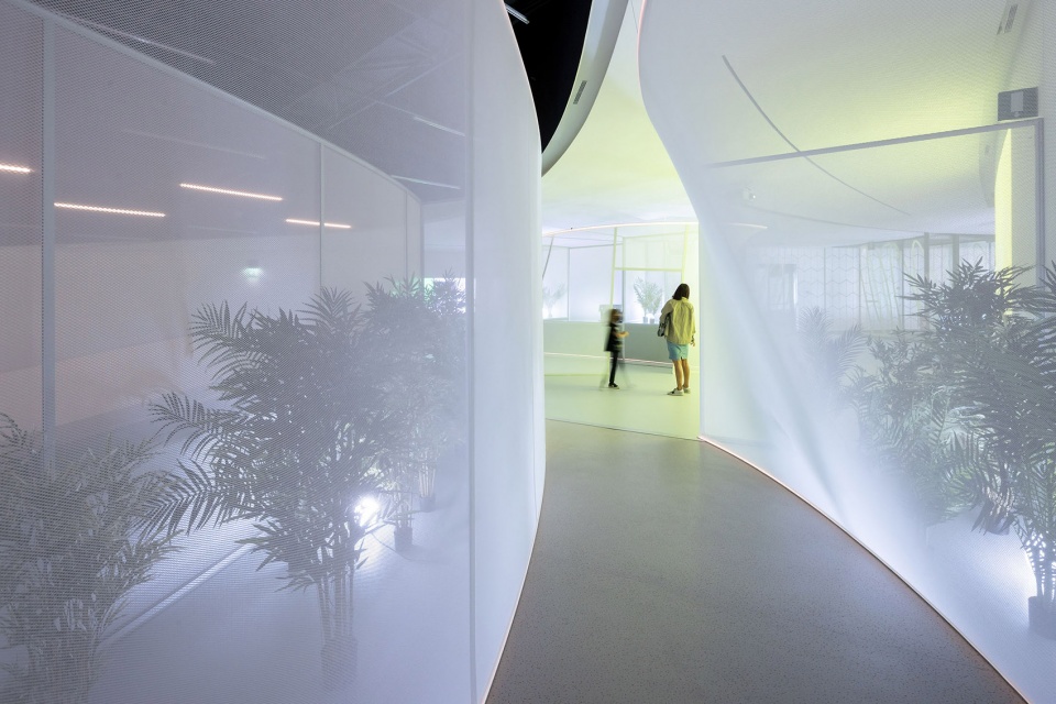 此外,Beeline还在建筑中引入了一系列的空间和体验,将博物馆转变为一个多功能的市民舞台。在中心区域,路径被分割并重构成了两层由楼梯连通的聚集空间。通过将结构包裹在膜片中,该装置呈现出朦胧的光亮。不同的层次在新空间之中形成了一个可供交流、展现投射肌理的柔软围护结构。