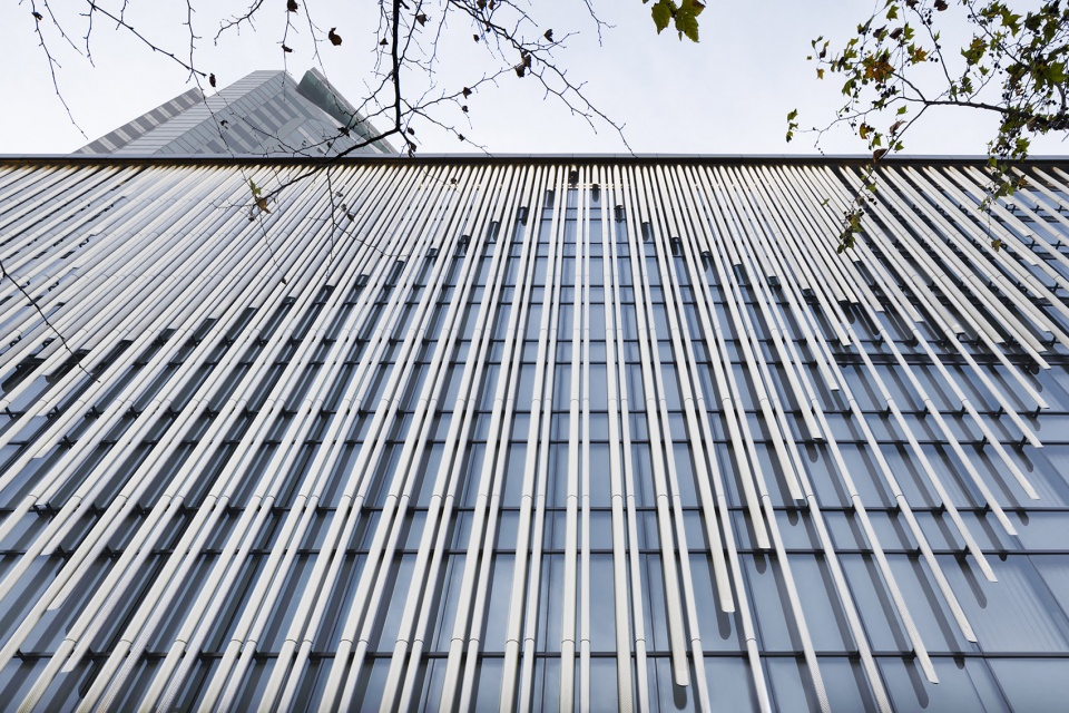 ▼铝管构成的屏墙“覆盖”在中庭的表面,screens made of aluminum pipes are draping over the atrium ©Takumi Ota