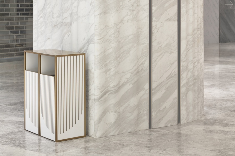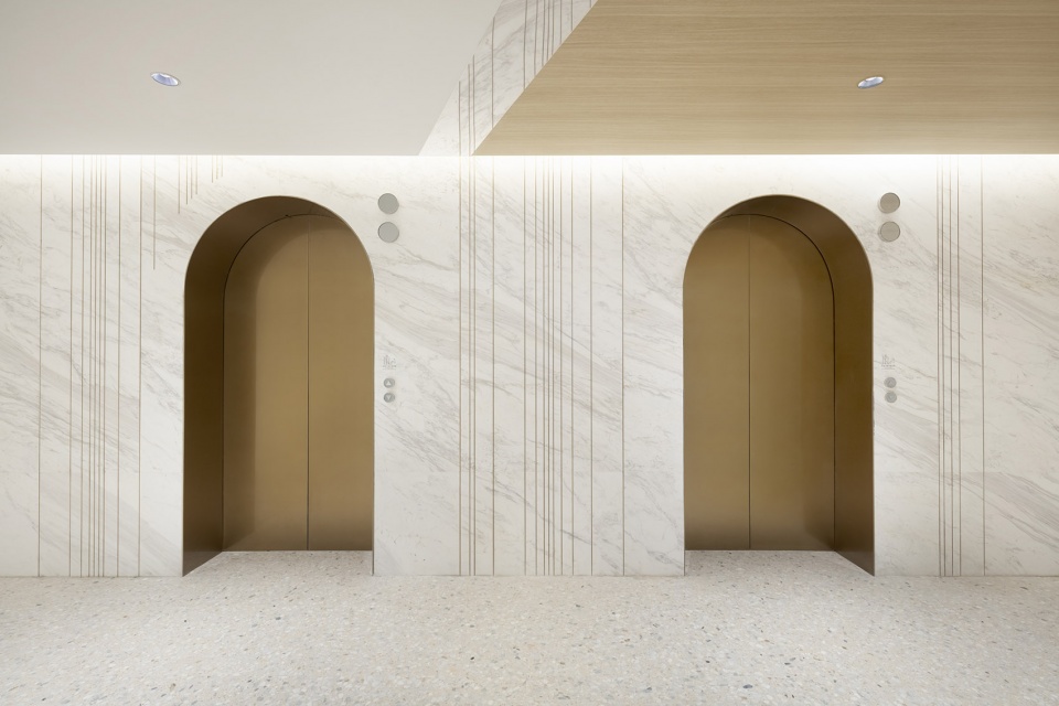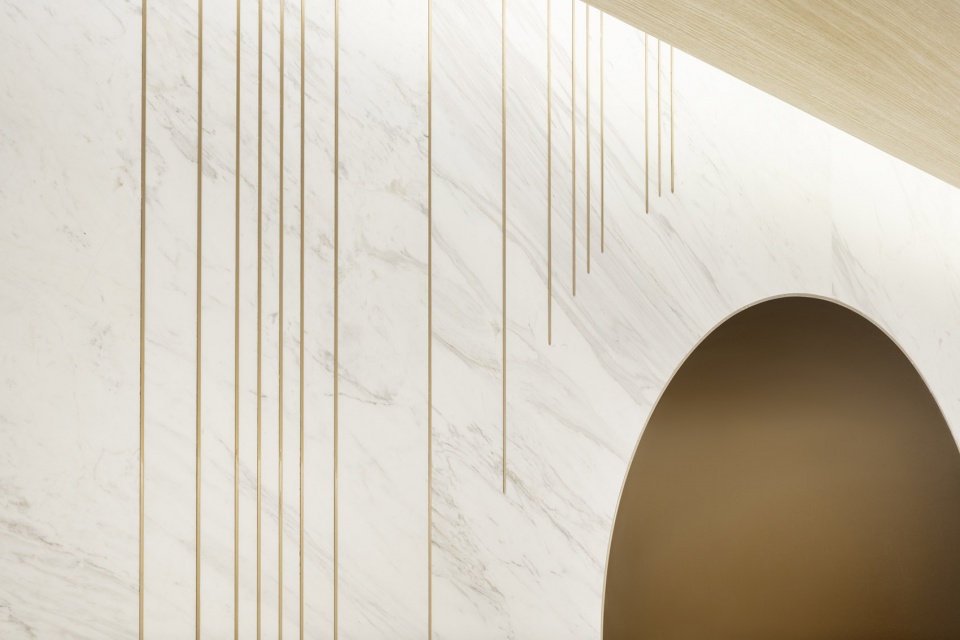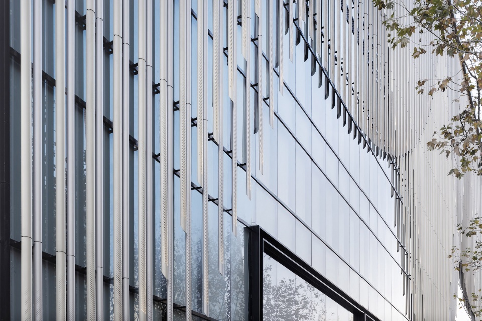 铝管构成的屏墙受到了舞台幕布的启发,“覆盖”在建筑立面和中庭的表面。这一设计语言同时也延续至主要的立柱和石砌的墙面。此外,建筑内部的隔墙、家具甚至灯光都融入了类似于舞台前庭的拱形意象,为空间增添了柔和与亲切的感觉。中庭处还设置了伸出的箱式休闲座位区以及像王室包厢般的VIP休息室。
