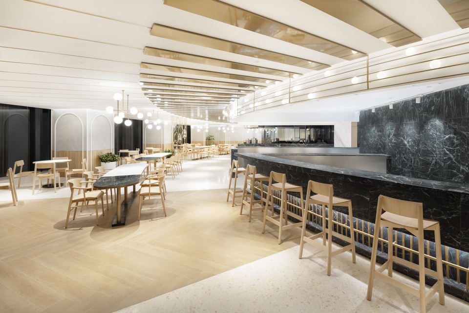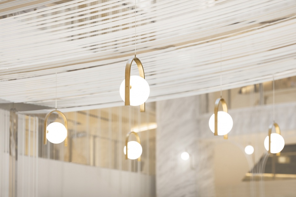 Screens made of aluminum pipes were inspired by stage curtains draping over the building facade and atrium. An image mirroring the draping design was also applied on the main pillars and stone wall finish. Further, we took the arch-shaped motif framing the front of a stage, the proscenium arch, and actively applied it to partitions, furniture, and even lighting in anticipation of an added softness and intimacy to the space. Box seating break areas protruding out to the atrium and a royal box-like VIP lounge were also added.