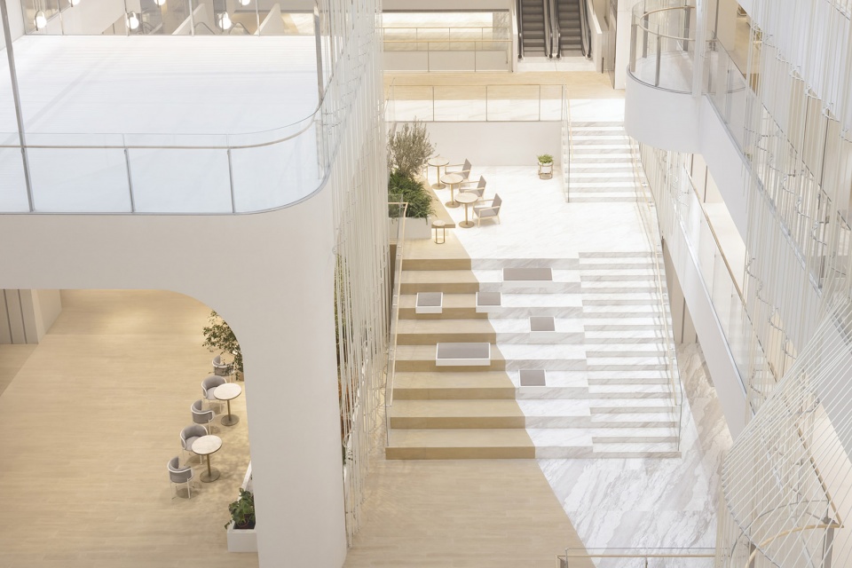 The existing structure had been much rebuilt and expanded upon, resulting in zigzagging traffic lines and exceedingly poor visibility through the building. While there were many atriums, their shape-reminiscent of wells-were not contributing to the sense of connection with the upper floors. And so first, we straightened the central passage on the ground floor to aid customers coming in from outside, while also relocating the escalators to secure circulation to upper floors for a smoother shopping experience. Then, the well-like atriums were rearranged to shift gradually, to unveil the view of the floors above the further one ventures by correlating the line of sight with the line of traffic, to create an environment that attracts shoppers to the upper floors.
