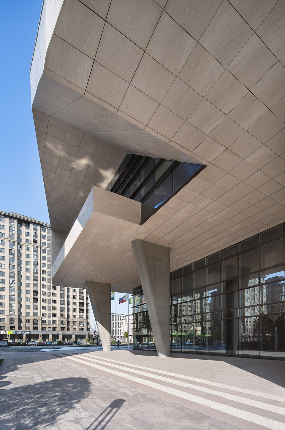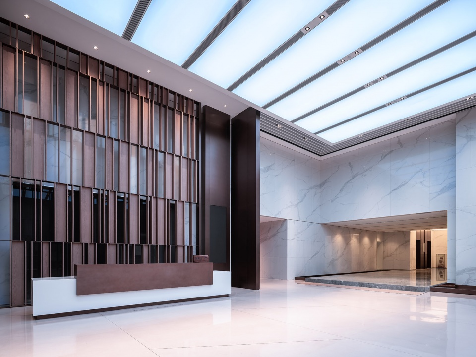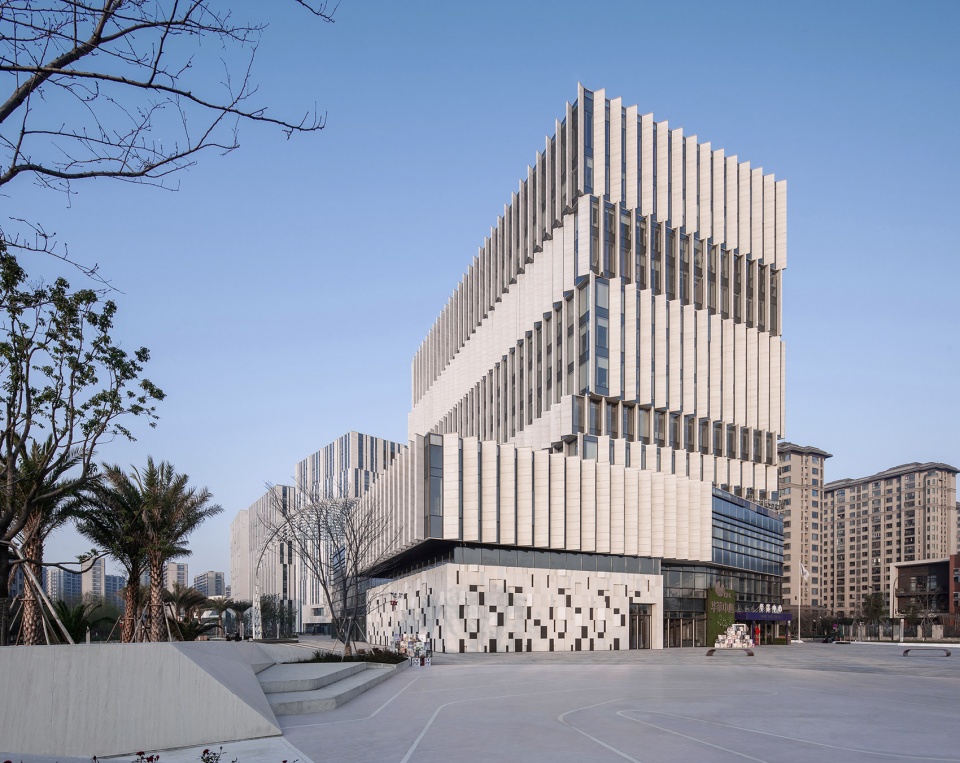 Light and shadow are important elements of film and television works. How to express “light and shadow” on the building skin is another important problem that needs to be solved in the design. The trajectory of light reflection and refraction expressed in abstract language is used on multi-storey buildings. The formal language with sculptural and tension forms a dialogue with people at a near scale. It is easier to draw the attention of the city here, foreshadowing the visual story is slowly presented here. In addition, the virtual and real changes of light and shadow are expressed in high-rise buildings. The façade is dramatically overhanged the stone decorative construction. The different angled facade blocks are deliberately set up with different angles of stone construction, and the changes of light and shadow will be in every moment. The facade presents differently, virtual and real, light and shadow make the building and light have a wonderful relationship.