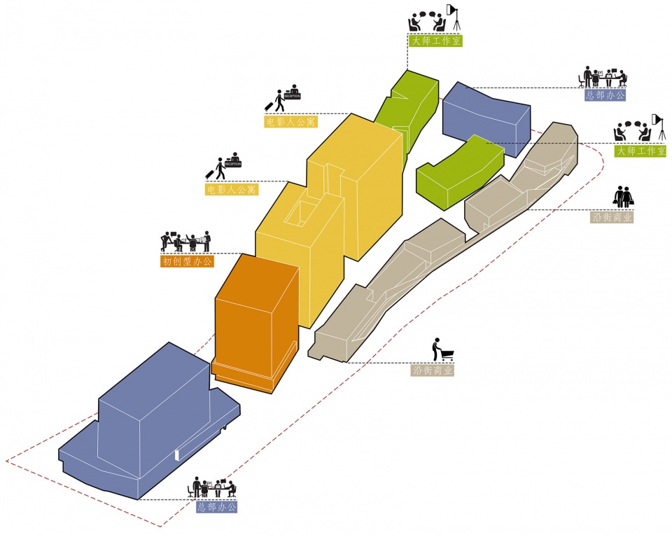 The project is a national cultural export project, the owner is a benchmark enterprise in the film and television industry, and the designer will complete a park belonging to film and television people. The working methods of film and television people are special. Their creations are often based on a crew as a working group where is largely creations of films happening among multi-companies and multi-working groups. Because of the long-term business trips of the filming or production tasks, lively party events are often held after film production, meanwhile, next shooting task or project is going to be hit-upon during the fancy parties. In addition, high-trend activities such as shows, exhibitions, and film festivals often occur. Much more public and sharing spaces are demanded among the film and television workers.