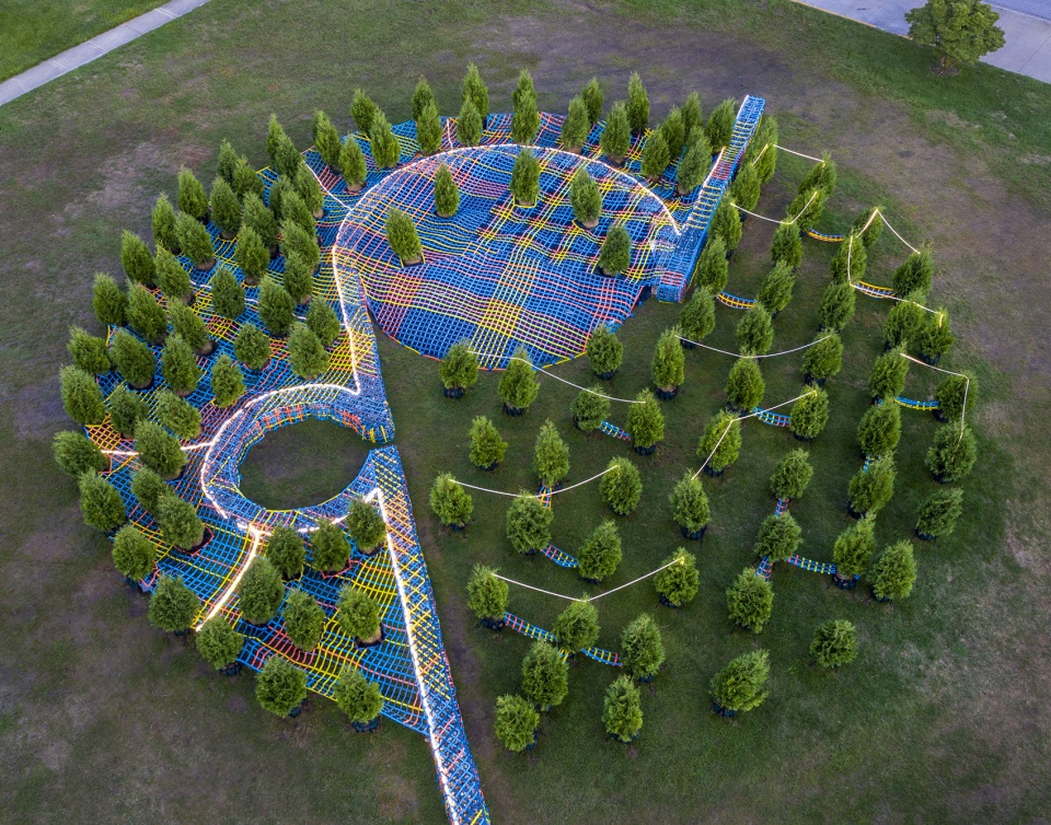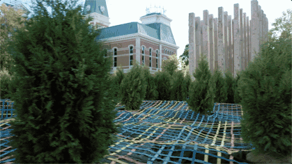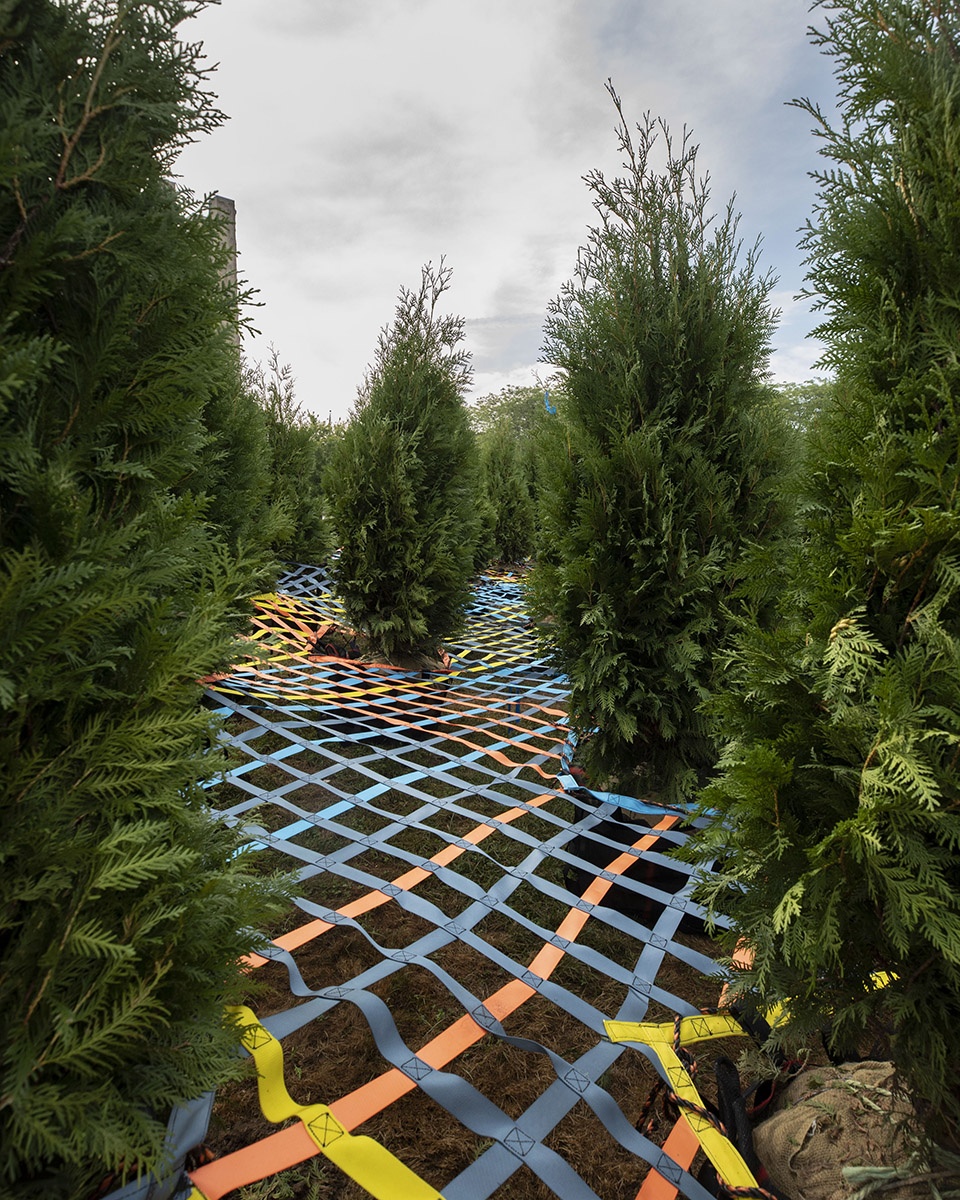 建筑事务所SO – IL与Miller House and Garden合作,购买了130棵活侧柏,将它们放置在Bartholomew县法院(Bartholomew County Courthouse)前的草坪上,结合着彩色绳带,打造出一个大型的吊床结构。展览结束后,这些侧柏将被永久地留在草坪上,从而将本装置项目的原始建筑灵感与哥伦布市的Bartholomew县——印第安达州七个国家历史地标之一——的管理工作直接联系在一起。