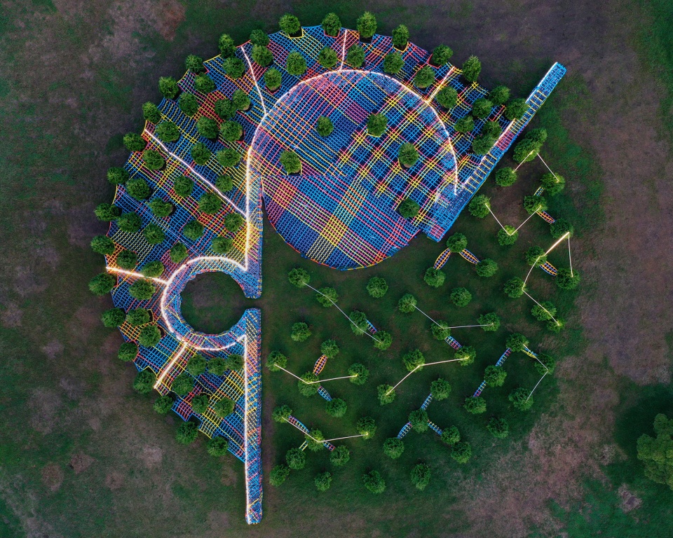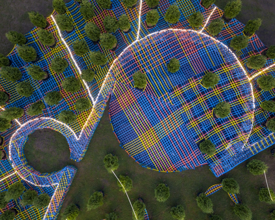 ▼装置俯视图,侧柏结合着彩色绳带,打造出一个大型的吊床结构,top view of the installation, the Arbor Vitae trees combine with nylon webbing, creating a large hammock structure © Hadley Fruit and Exhibit Columbus
