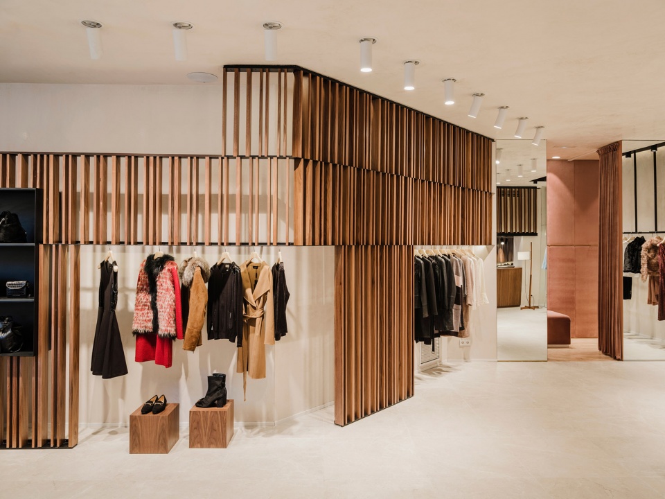 门店的设计采用了与米拉之家的弧形立面相似的石灰石材料,店面的所有金属构件则以黑钢板构成。这些元素在项目中的作用正如阳台对米拉之家的作用一样,是贯穿整个设计的、一条创新性的重要线索。室内设计还融合了品牌惯用的胡桃木元素,使截然不同的材料在对比中产生共鸣。