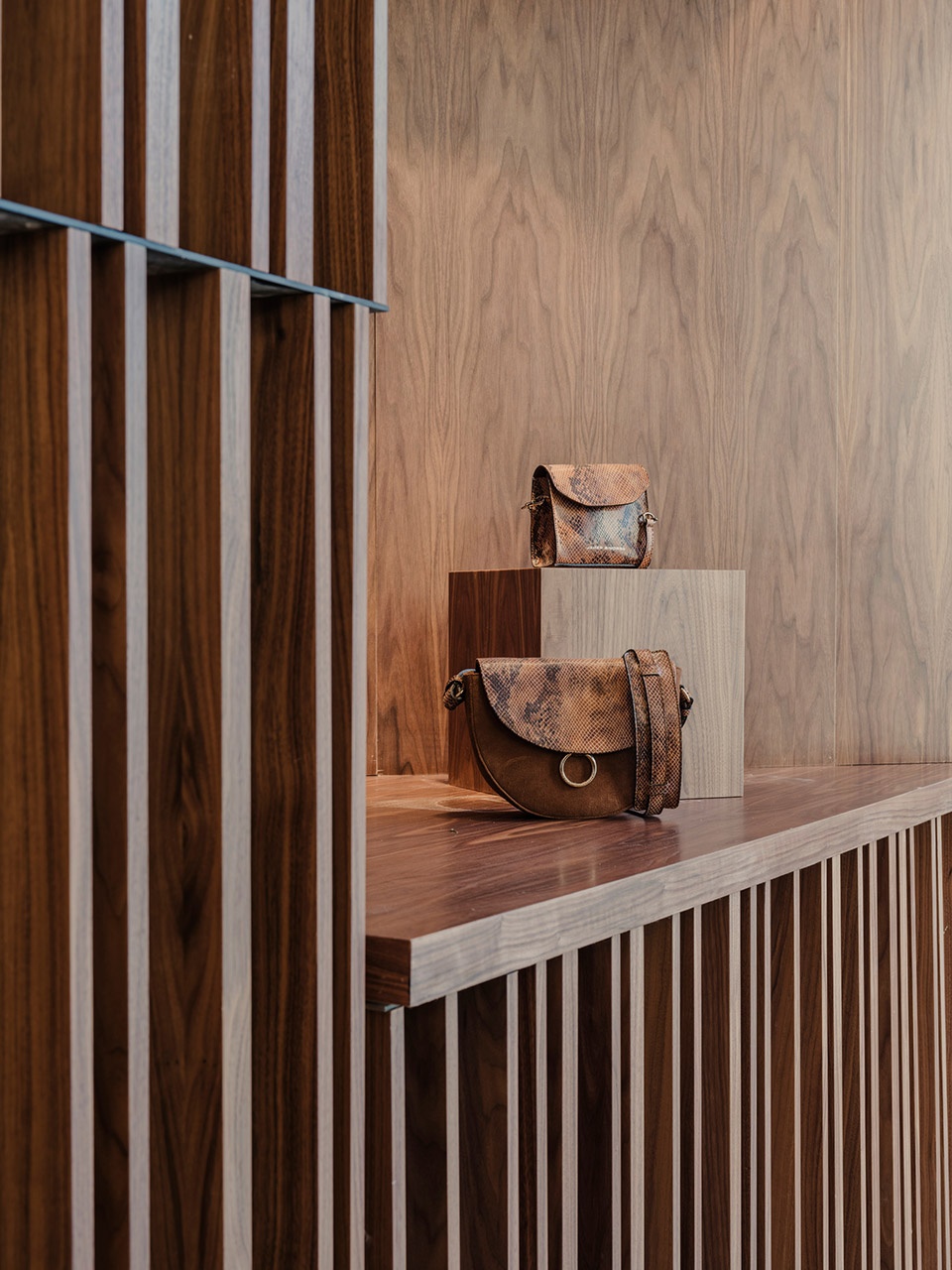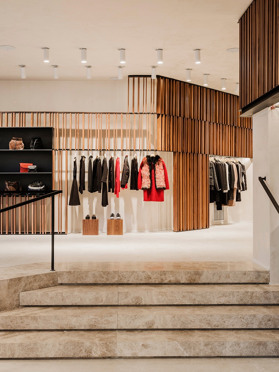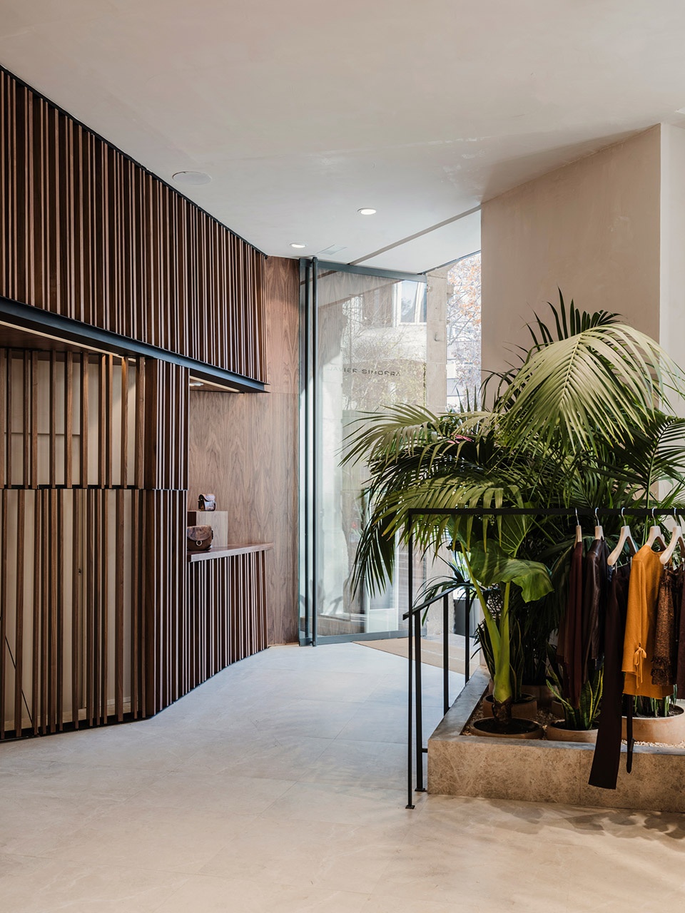 We used limestone, similar to Casa Mila’s curved facade material, and black iron for all store finishings made out of metal. These referenced to Casa Mila ́s balconies, innovative in their function as a spine across the entire Gaudí building, and, when combined with the Javier Simorra walnut, create a symbiosis between two very distinct materials.