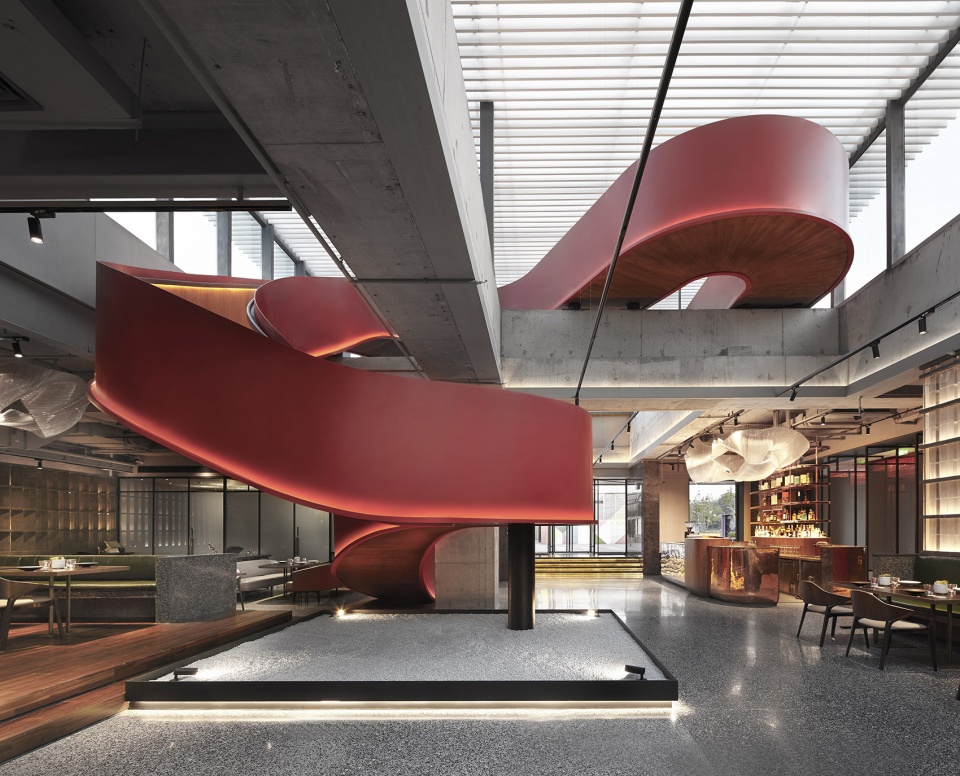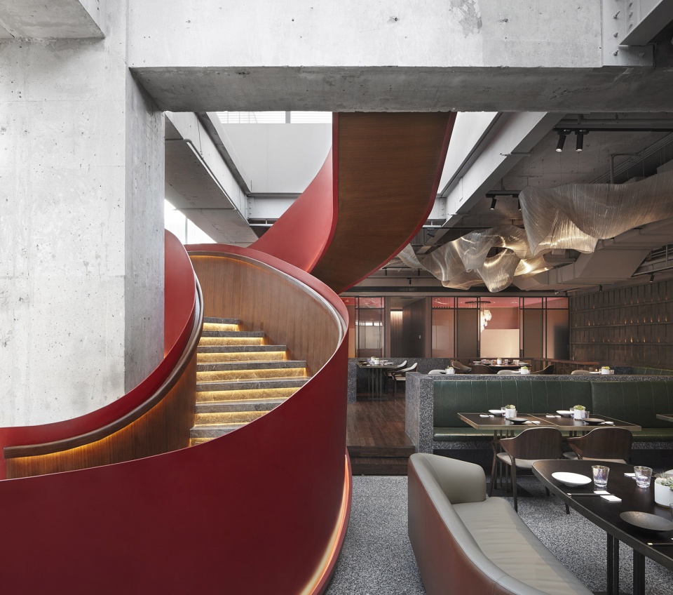 ▼红色金属楼梯扶摇而上,统领整个空间,the red staircase is the soul of JE Beijing ©锐景摄影