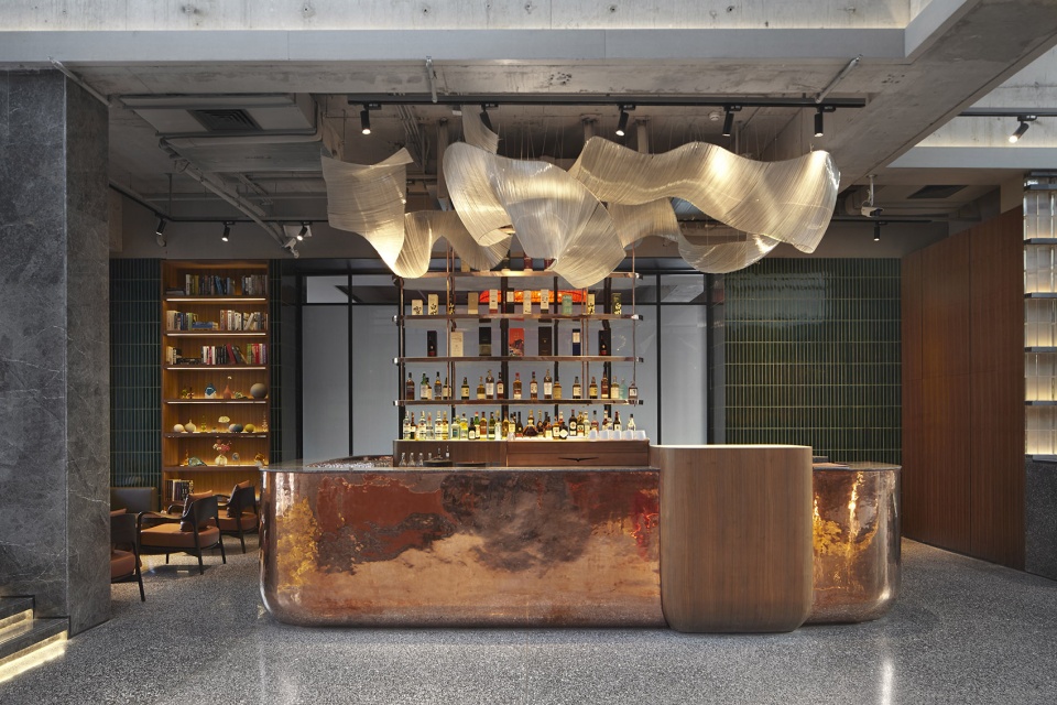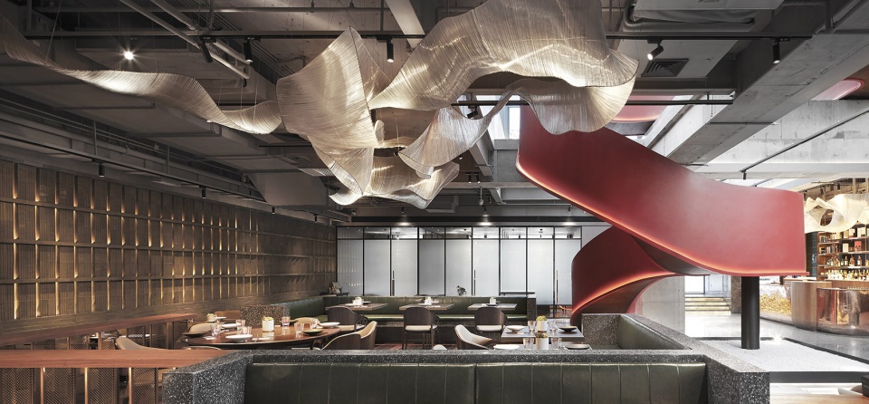 头顶的纱幔式样的玻璃灯具是曲线元素的延伸,以形意柔化空间,消解水泥与金属带来的刚性冷峻,契合用餐空间的氛围调度。