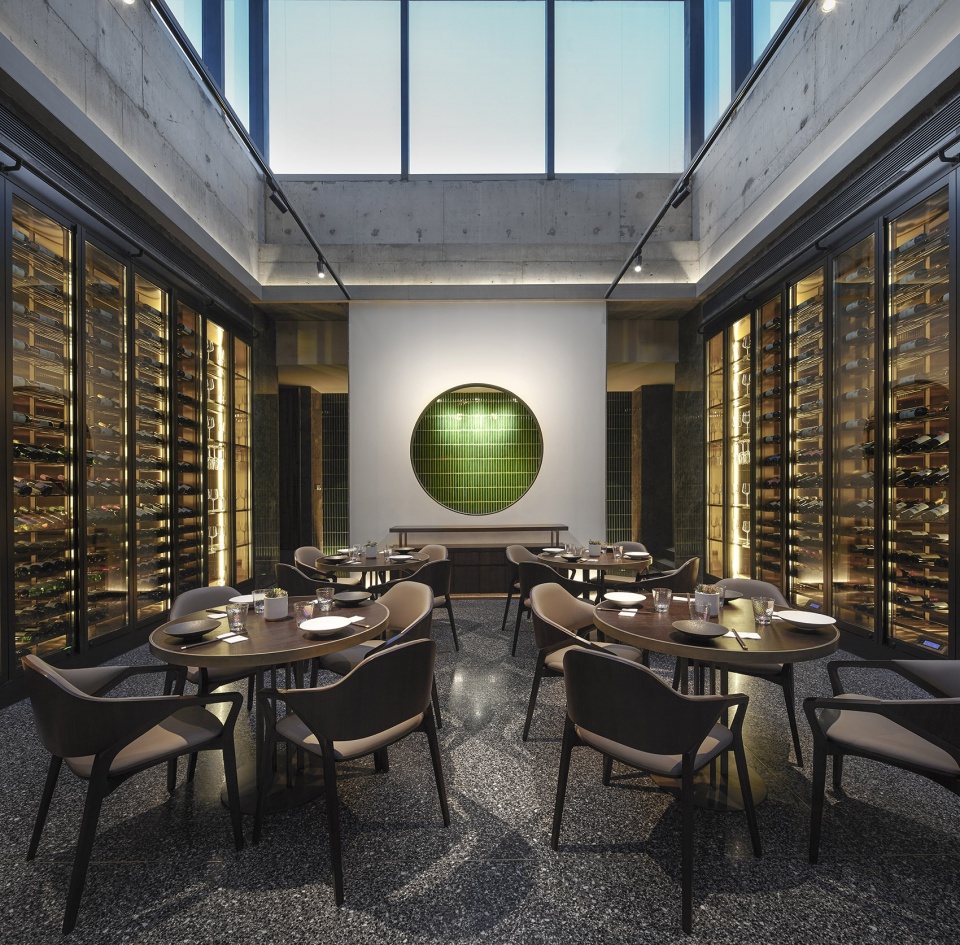 东方美学中,设计讲求和而不同。JE北京餐厅的清水混凝土外立面,内敛淡然,灯光的运用下,建筑的肌理显现,浑然散发先锋美术馆般的高级气场。