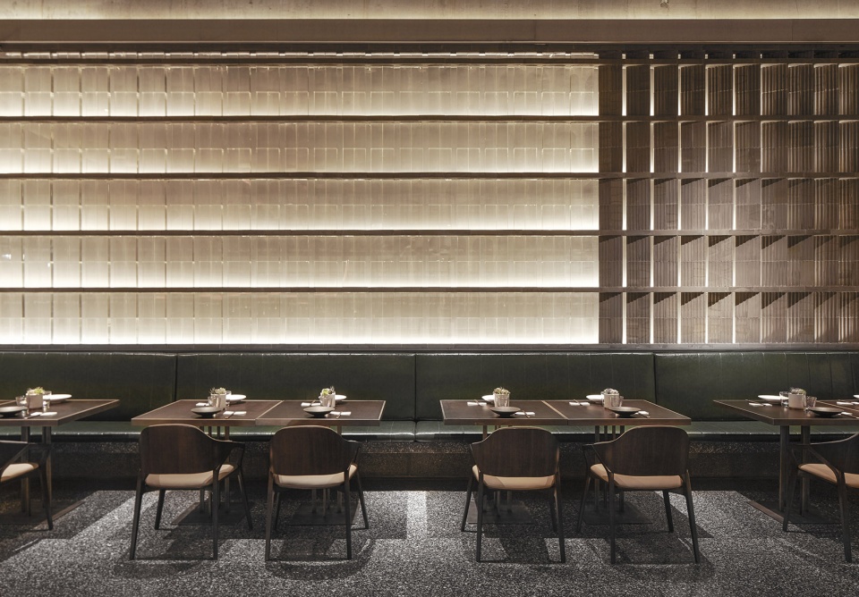 卡座沙发区和中庭,使用了复古与时尚并重的墨绿色。其上的墙面,设计师用玻璃砖和水泥砖纵横阡陌,极度粗砺与极度精致交错,为空间的第二重“皮肤”赋予丰富的可能性:白天在自然光下两种材质呈现虚实之趣,晚间,背灯的设计由内浸润出温暖静谧的光。明与暗,虚与实,呼吸式流转,从不同用餐区看过来,或是不同时间来用餐,景与境皆不尽相同。