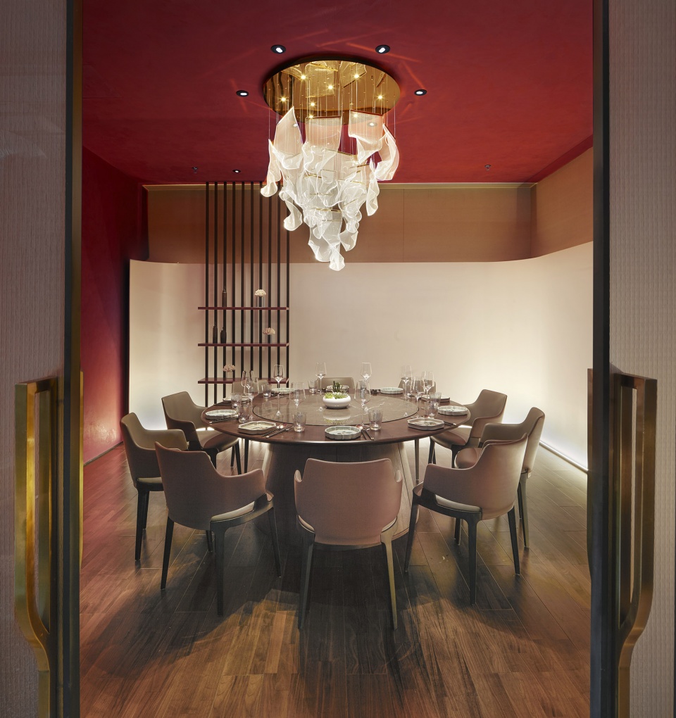 The red staircase is the soul of JE Beijing, and divided the space into delicate levels. As far as the eyes can see, there is no rigid cover, and the semi-enclosed space is inspired by the Chinese courtyard. With low walls, high back sofas, different shapes of tables and chairs, and even light and shadow, every guest enjoys different scenes besides overall layout. And its multiple atmospheres are also suitable for different dining scenarios.