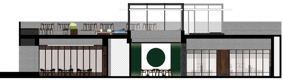 The hanging veil-like glass lamps soften the space in an abstract way. And it dissolve the rigidity and coldness brought by cement and metal in the space, and fit the atmosphere scheduling of the dining space.