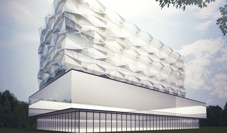 本设计的步骤如下:首先,根据宴会、餐厅、客房等重要功能的不同面积和高度,在场地内设置了三个立方体。其次,这些体量被旋转到最佳景观点,因此宴会厅、客房和餐厅分别拥有最佳的视野,可以看到田野、公园和河流。之后,从二楼向上,规划了房间单元,所有这些都有最佳的阳光条件和壮丽的景观河和公园。餐厅上方的屋顶创造了一个最佳的评价室外空间,从家庭房间直接进入,因此自然和设计之间的关系是通过与环境的合作精心的设计控制来实现的。立面由玻璃模块组成,为所有的房间创造了阳台。