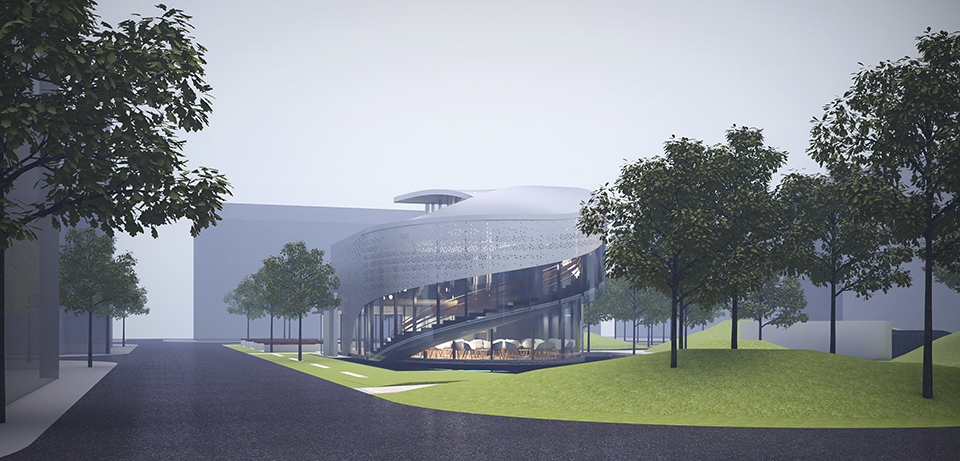 新咖啡馆坐落于八骏湾办公园区的正中心。漂浮于园区中心现有池塘的中央。建筑概念来源于水滴,滴落在水面上产生的涟漪与周围的景观植被的有机形态的自然分布形成呼应。从一侧看,建筑部分的正方形的刚性纯几何形状和另一侧的景观人造青山的有机形态相映成趣。因此,这也解释了为什么我们的建筑是纯粹的几何形状与根据自然景观所生成有机形体的结合。
