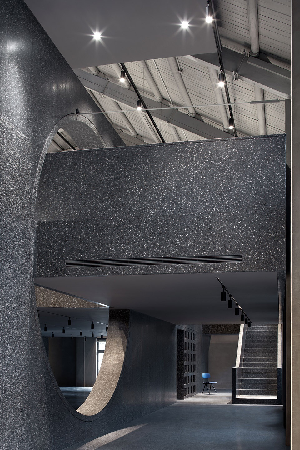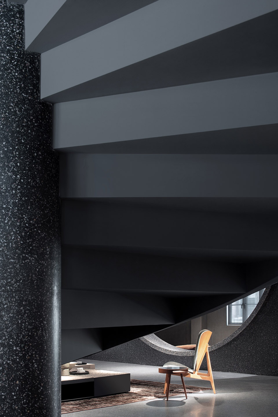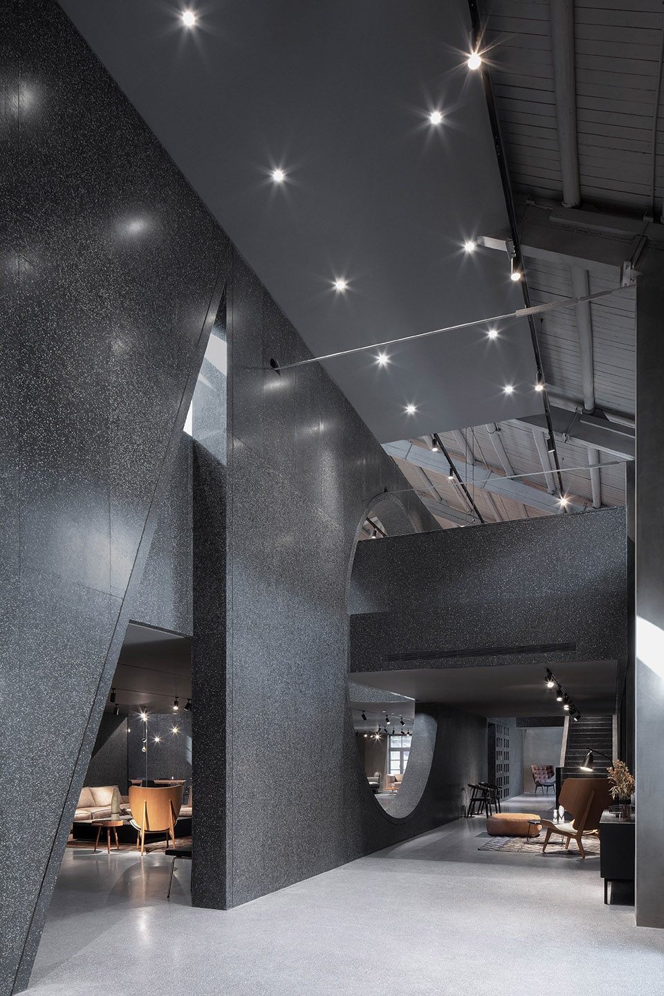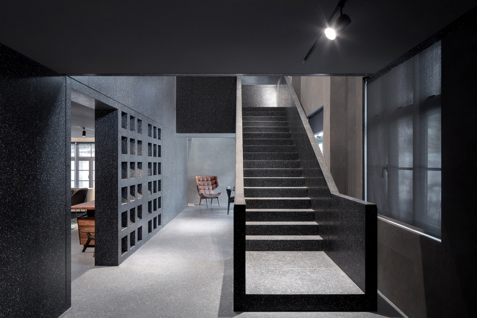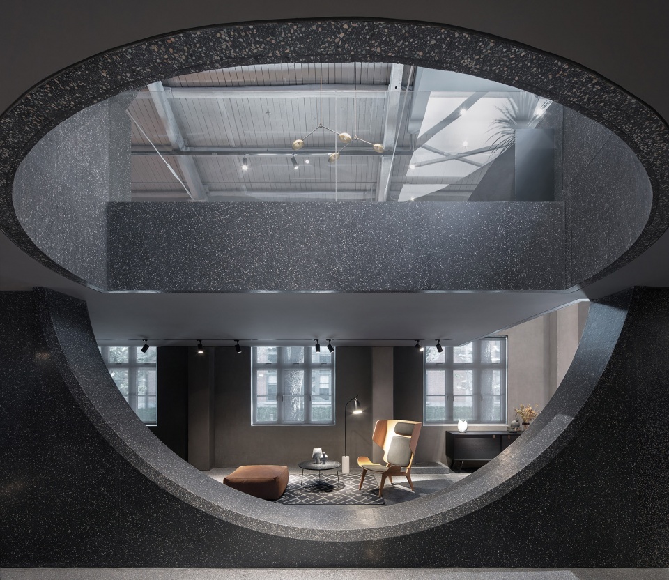 The mezzanine floor between the two newly-built walls was designed to accommodate the furniture display and can be reached by two sets of stairs in different shapes – one in spiral and one straight. The floor slab cantilevered out from the openings on the wall forms the indoor balconies situated on both sides of the aisles. All the newly inserted walls and floors are lined with black terrazzo. Some circle and semi-circle shapes are craved out of the floor and the walls, which can give the hints of the entrance and cast some light through the route for one’s journey in the showroom.