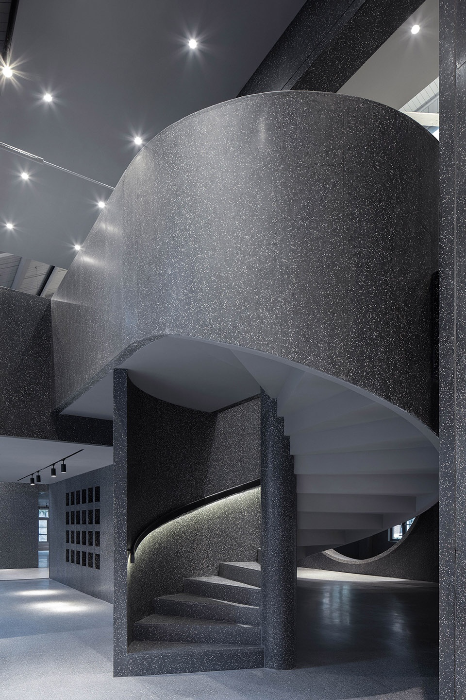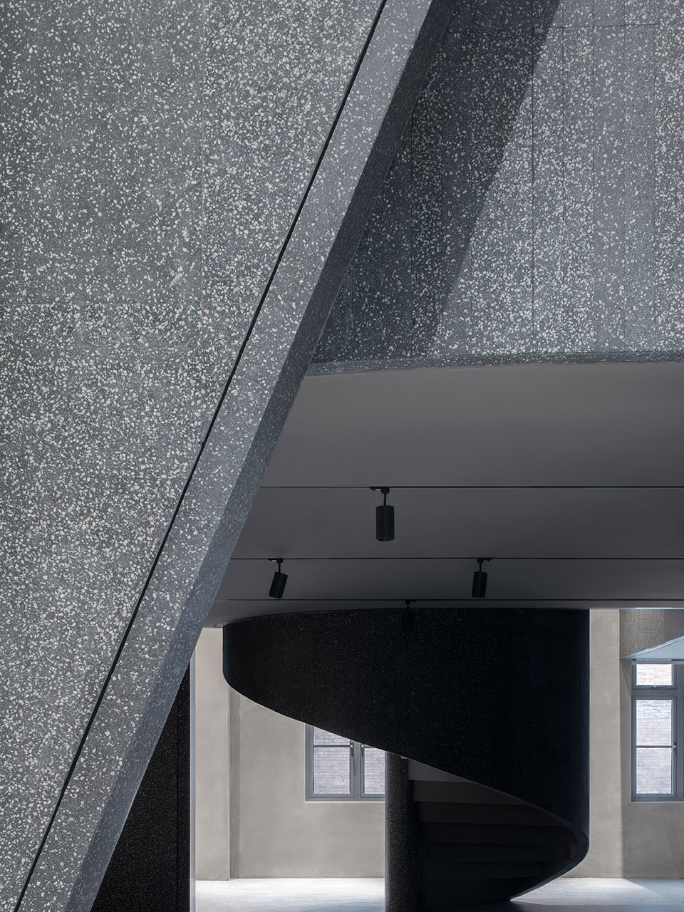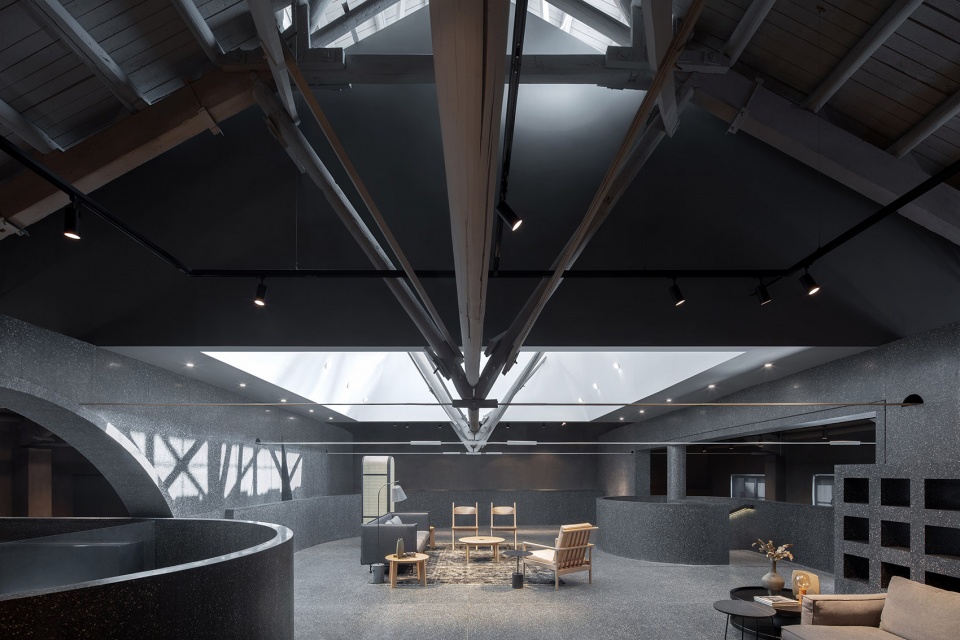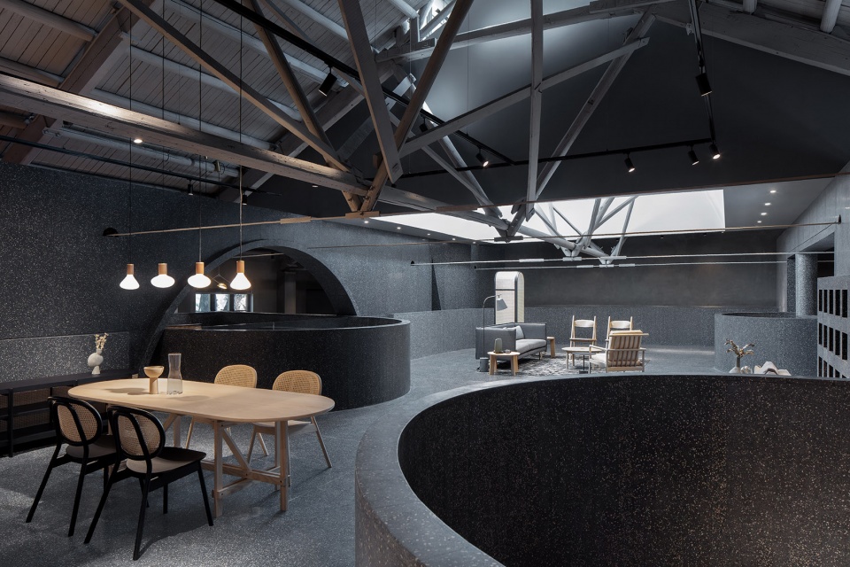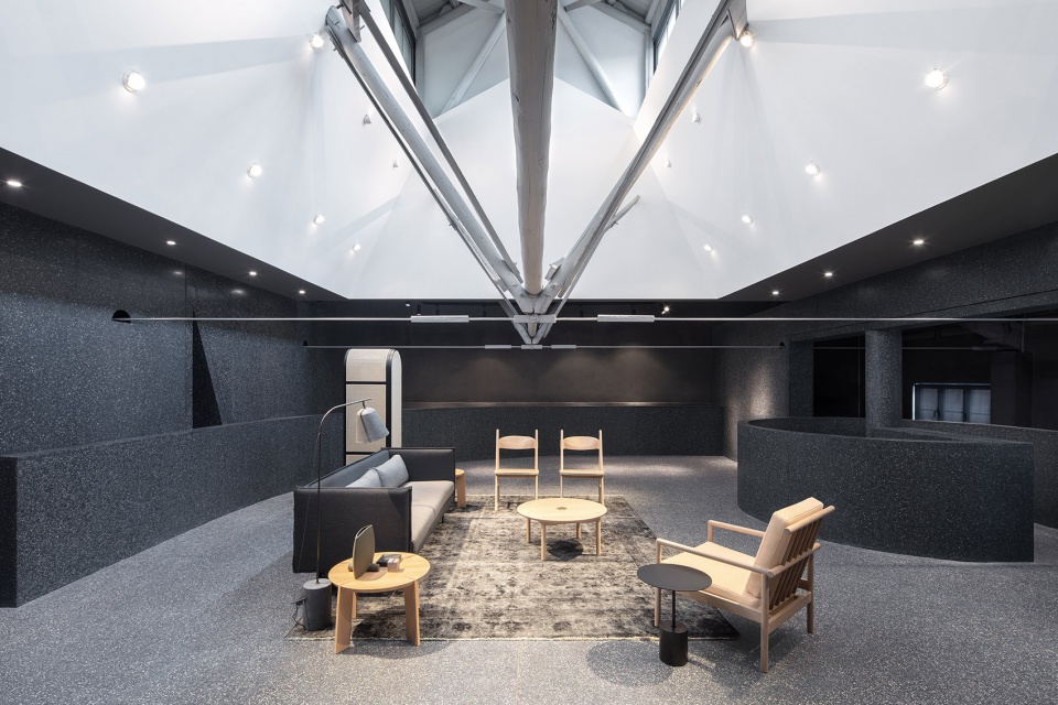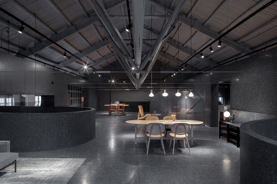 The mezzanine floor between the two newly-built walls was designed to accommodate the furniture display and can be reached by two sets of stairs in different shapes – one in spiral and one straight. The floor slab cantilevered out from the openings on the wall forms the indoor balconies situated on both sides of the aisles. All the newly inserted walls and floors are lined with black terrazzo. Some circle and semi-circle shapes are craved out of the floor and the walls, which can give the hints of the entrance and cast some light through the route for one’s journey in the showroom.