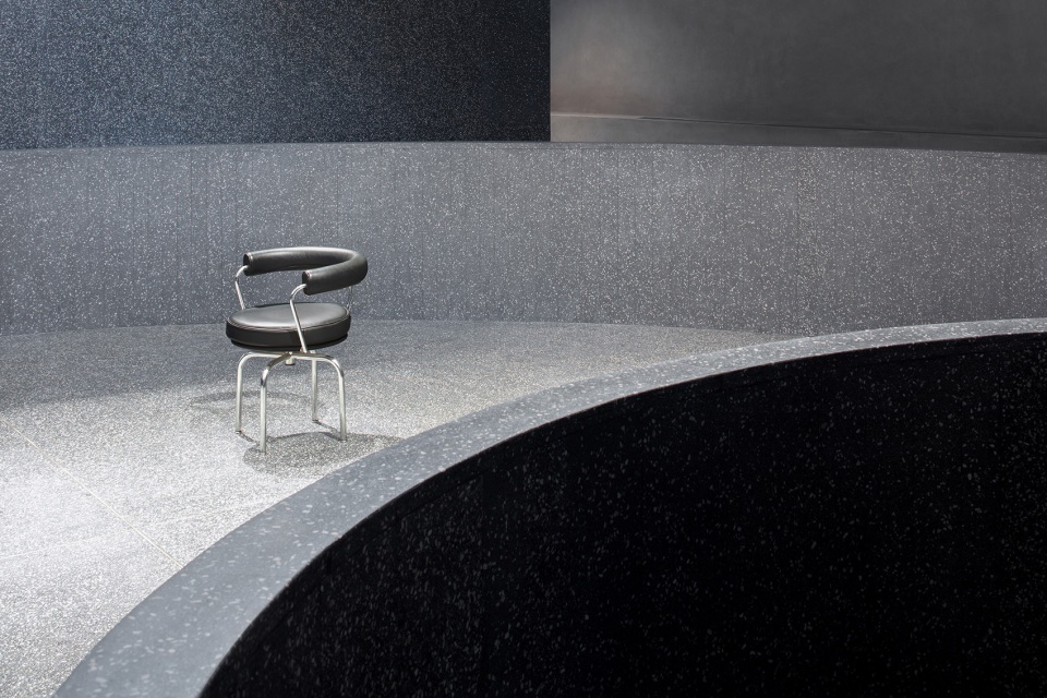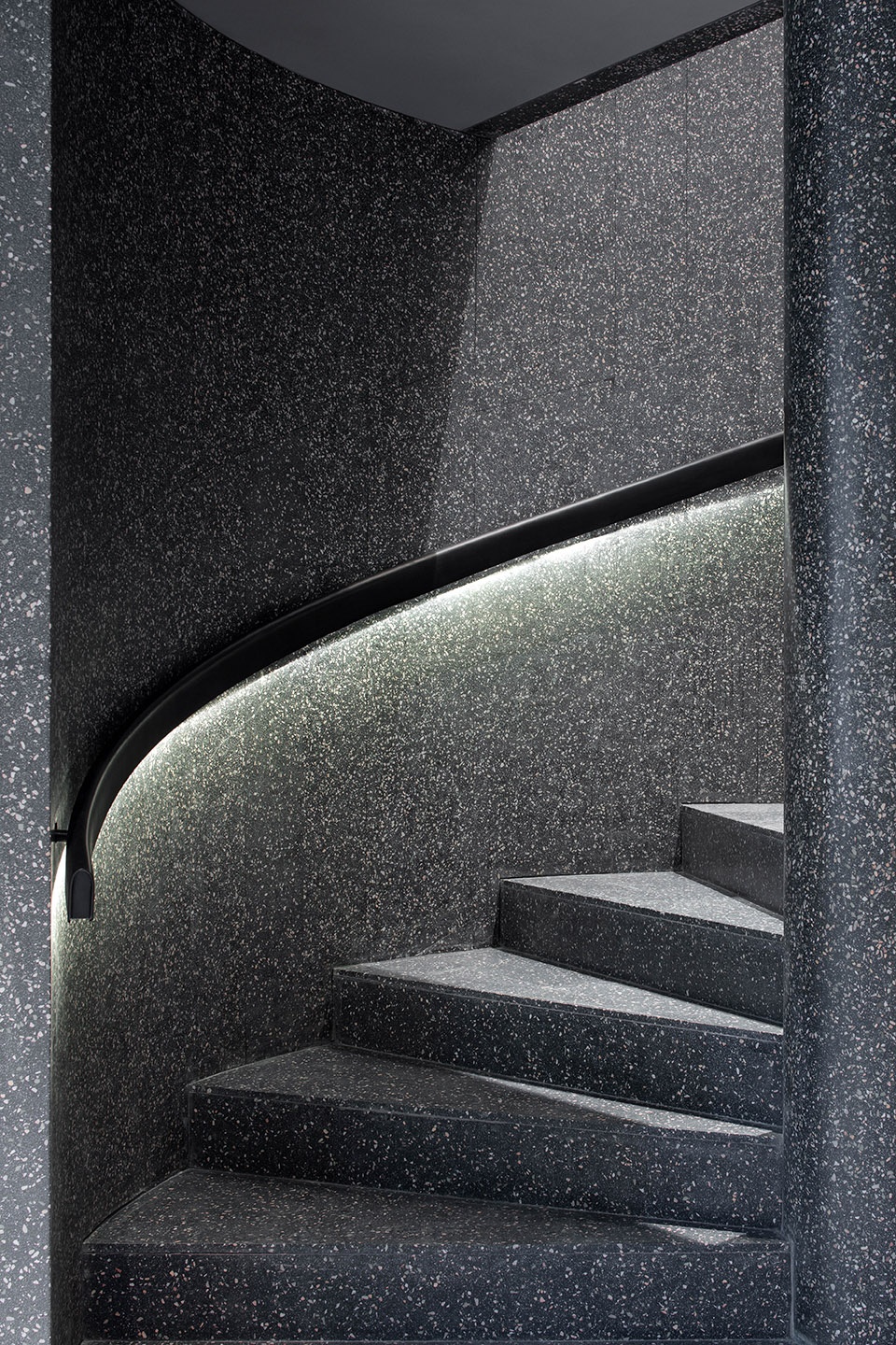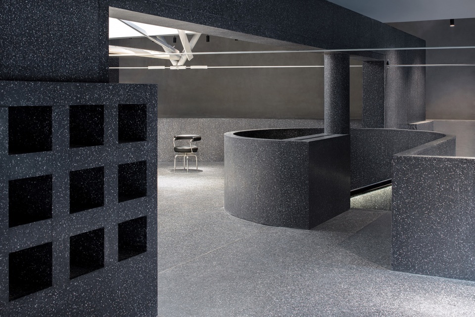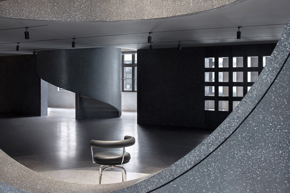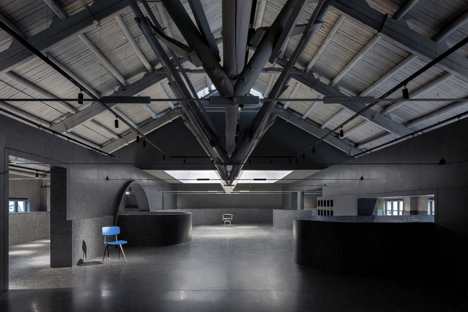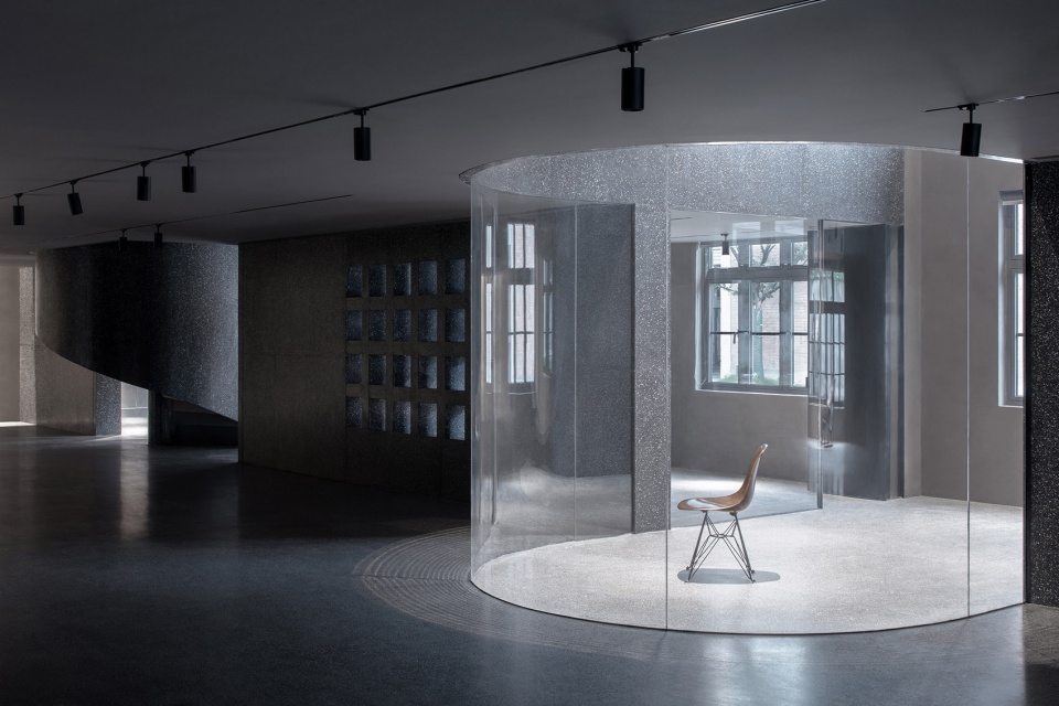 The mezzanine floor between the two newly-built walls was designed to accommodate the furniture display and can be reached by two sets of stairs in different shapes – one in spiral and one straight. The floor slab cantilevered out from the openings on the wall forms the indoor balconies situated on both sides of the aisles. All the newly inserted walls and floors are lined with black terrazzo. Some circle and semi-circle shapes are craved out of the floor and the walls, which can give the hints of the entrance and cast some light through the route for one’s journey in the showroom.