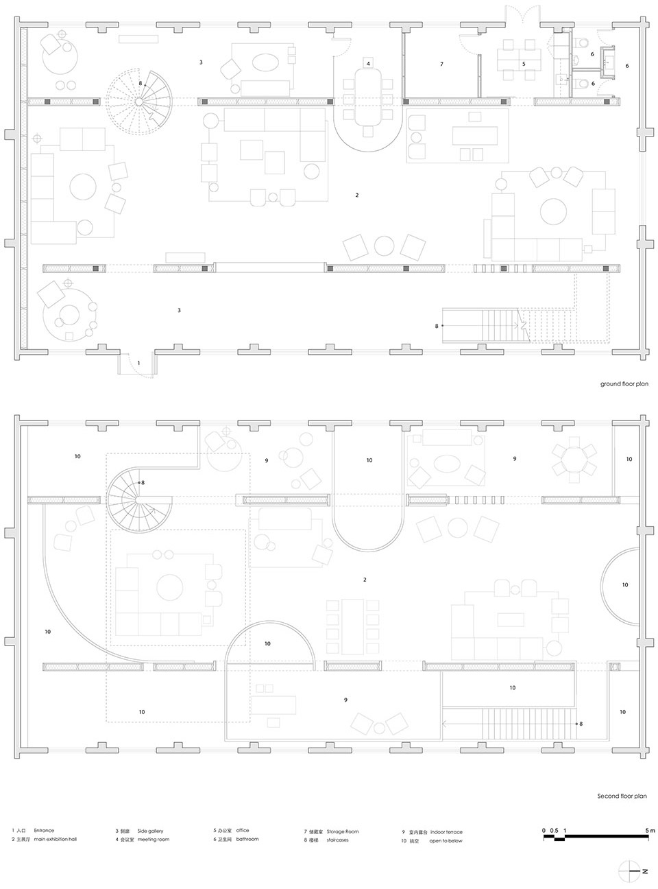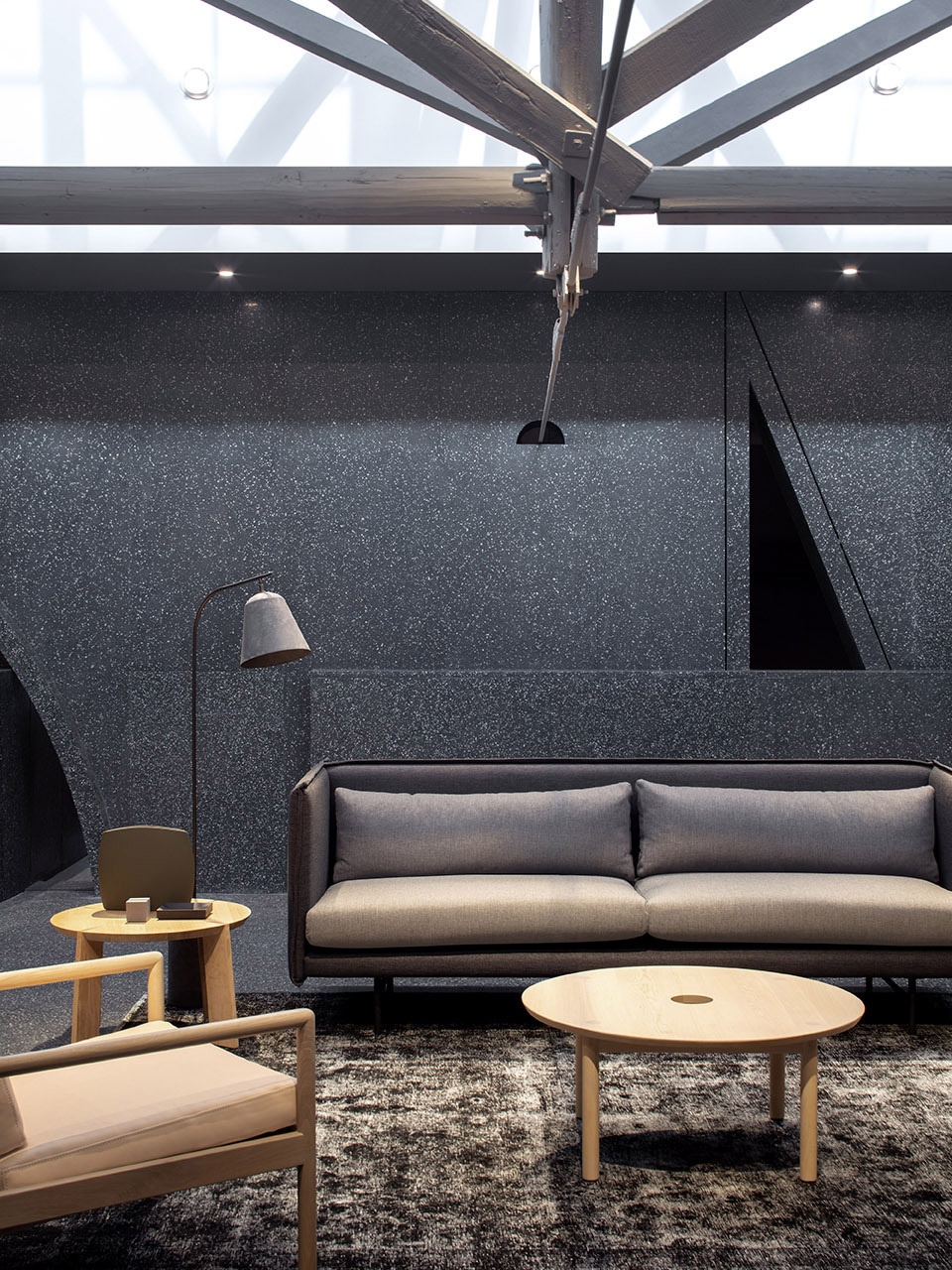 In thinking about how to add layers to the original interior of which was just a rectangular structure with no features, the designer’s strategy was to erect two walls that run across the full length of the interior so the space was divided into three bays in 1: 2: 1 scale. In the end, the central exhibition hall and two side aisles was formed to adapt to various furniture settings. These two 25 – meters, continuous walls can also provide sufficient background for small exhibitions and events.