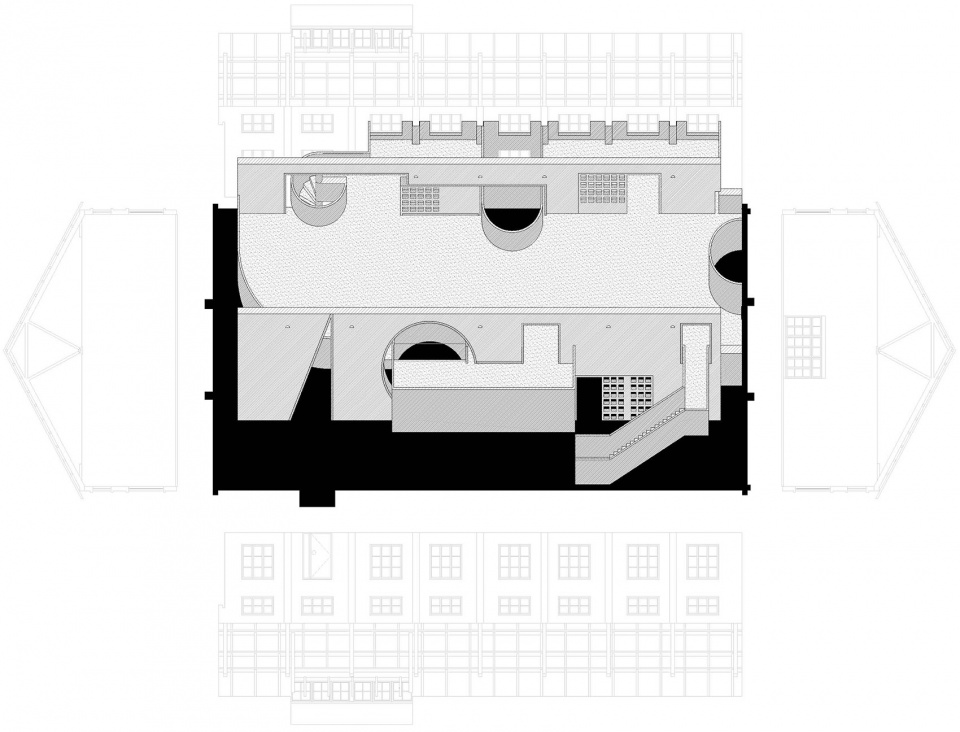 ▼夹层楼板和墙面上开凿互相嵌套的圆形或半圆形缺口,circular and semicircular openings on the wall and the floor slab of the mezzanine ©夏至