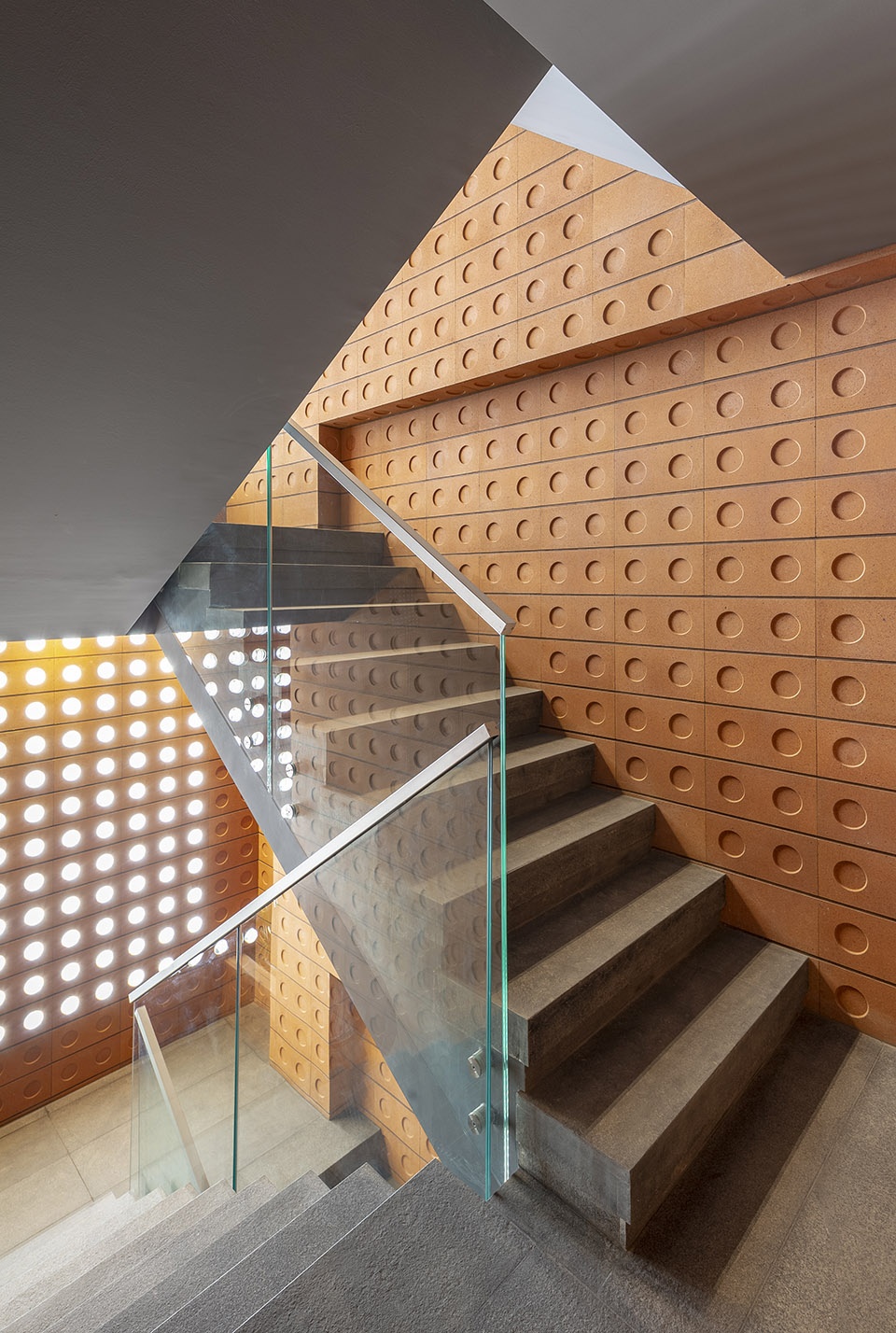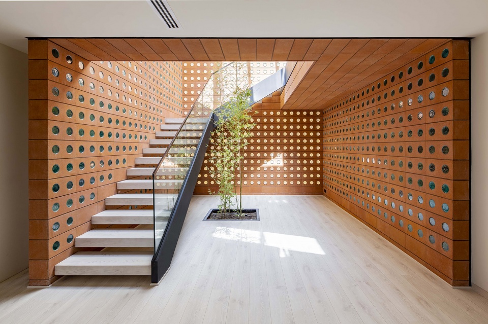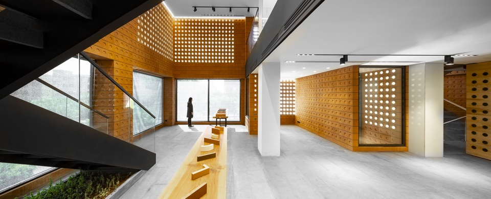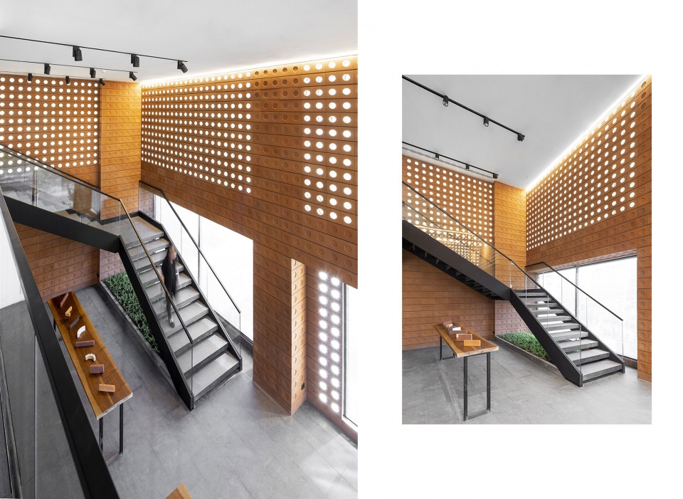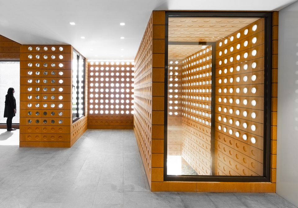 镜框砖将自然光以一种神秘的方式引入建筑内部,延缓了人们对建筑的感知,使建筑在白天和夜晚都处于一种既内敛又外放的状态。作为本次项目的唯一材料,镜框砖始终忠于它自身的几何形状。“渗透感”是镜框砖最为显著的特征。利用其半透明的特性,可将室内外空间融为一体,淡化两者之间的界限。团队意识到这种从外向内的渗透可以带来良好的通风和采光,于是便将该技术沿用来组织建筑的内部空间。