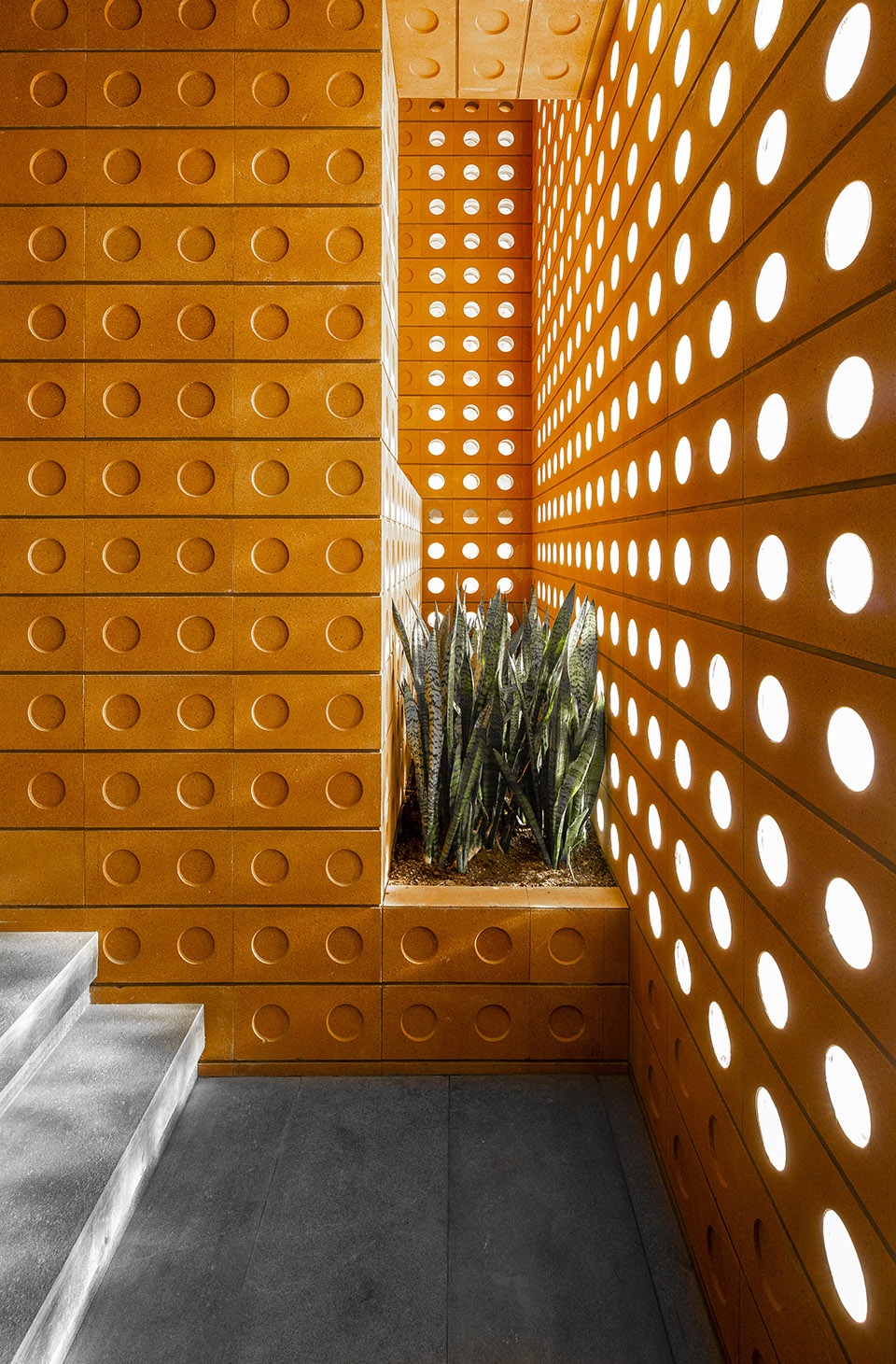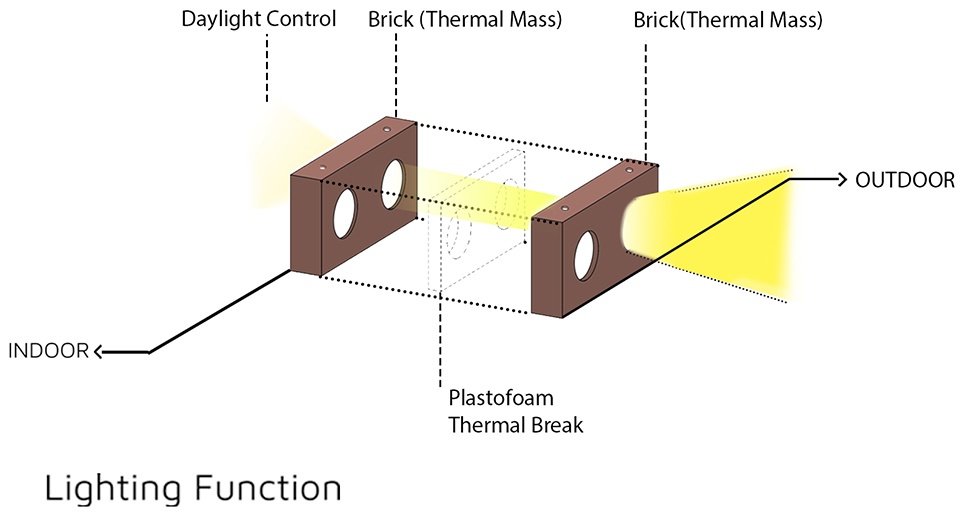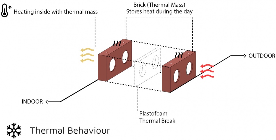 Bringing the natural lighting inside spaces in a mysterious way, the Spectacled Brick delayed the perceptions towards the building. It made the building both introverted and extroverted during day and night. It strictly banned other materials to take part in the making of the building and always kept loyal to its geometry. Penetration was the favorite notion for the Spectacled Brick. Making use of its semi-transparent nature, it merged the exterior with the interior to fade the boundary between the two. The spectacled brick was aware of the ventilation and light exposure benefits caused by the penetration of exterior to interior and used this technique to organize spaces inside the building.