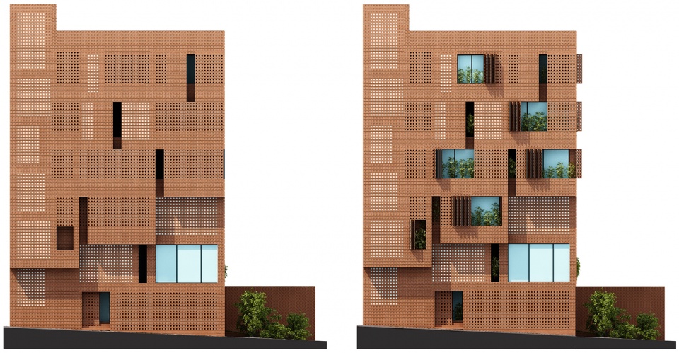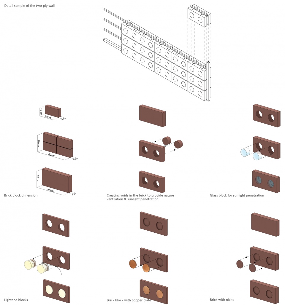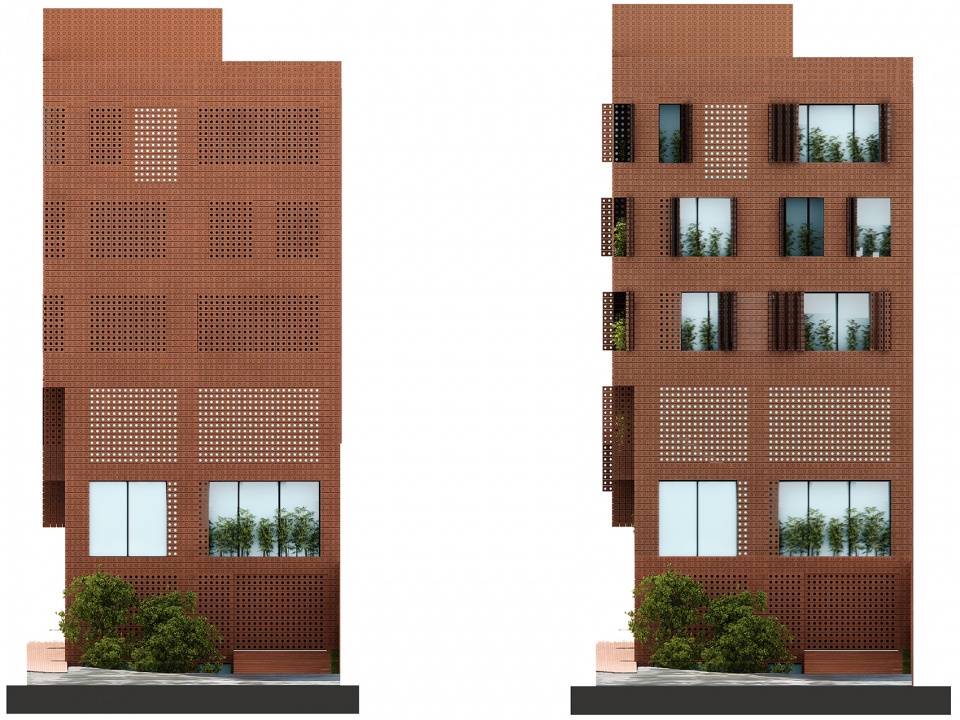 The spectacled brick integrated building qualities such as interior and exterior, introversion and extroversion, façade and space, transparency and solidity, natural and artificial lighting, to create a new phenomenon which not only carries features form both components, but also introduces new values to the system. Therefore, design challenges were resolved by merging these dual components into unique elements. It also used this homogeneity to address the programmatic requirement of the project which included both commercial and residential spaces. It tried to expand the commercial aspect of the brick showroom to the exterior and eventually to the city.
