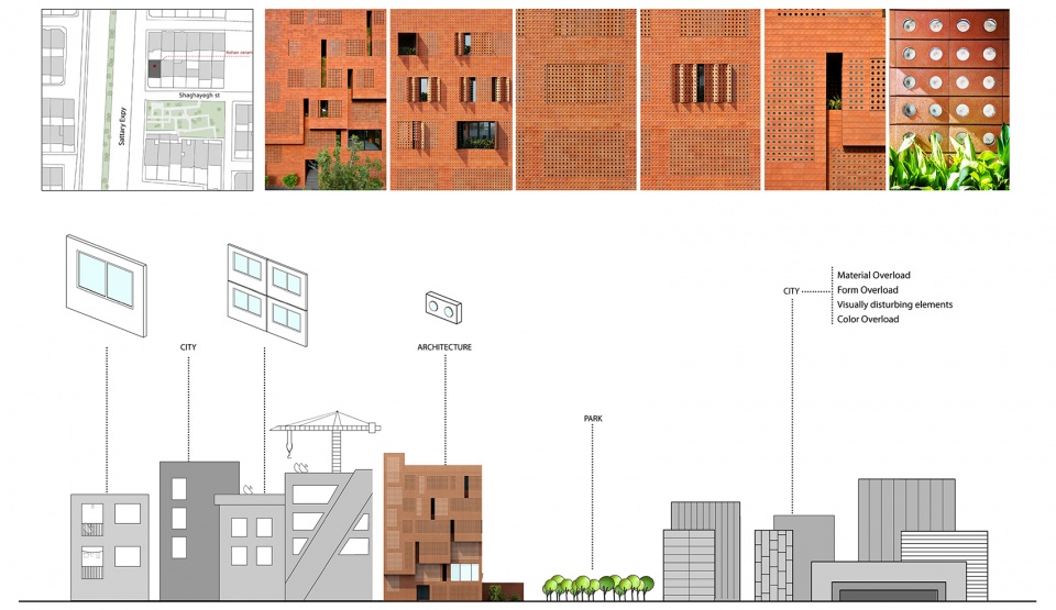 尽量减少建筑作为单一物体的形式表现,并强调其与城市的整体性,是否就能将城市风景统一?利用包括墙、窗、门在内的建筑元素,同时减少建筑材料的种类,可以在某种程度上解决上述问题。该项目将作为Kohan Ceram制砖厂的总部,设计师保留了现有的混凝土结构,并打造了一种极具代表性的特殊砖墙外立面。