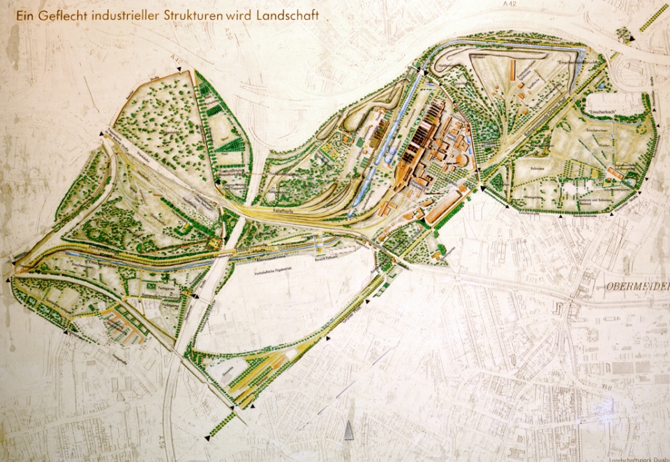 Thyssen-Meiderich炼铁厂于1985年4月完成了最后一批铁材的冶炼后关闭了最后的五号高炉,结束了生产,同时也于1989年开启了一段难以置信的新发展。当年德国政府致力于为旧工业区的环境、经济和社会转型制定一个高质量的建筑和规划标准,于鲁尔工业区举行了涵盖约100个项目的鲁尔区埃姆舍公园国际建筑展(IBA)。