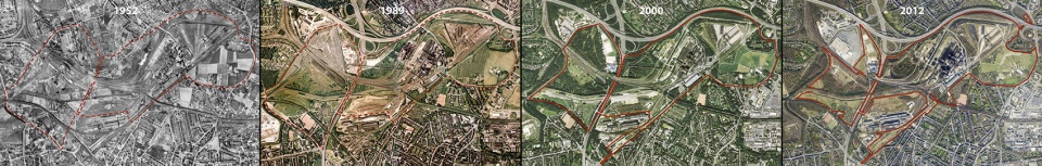 ▼1952年卫星图: 国际竞赛范围; 1989年卫星图: 炼铁厂最后一个高炉停产; 2000年卫星图: 第一轮规划改造范围; 2012年: 公 园建成卫星图 Photo from 1952: the competition site boundary.Photo from 1989: the site shortly after the last blast furnace had closed. Photo from 2000: the site boundary of the first development framework. Photo from 2012 showing the current park boundaries.